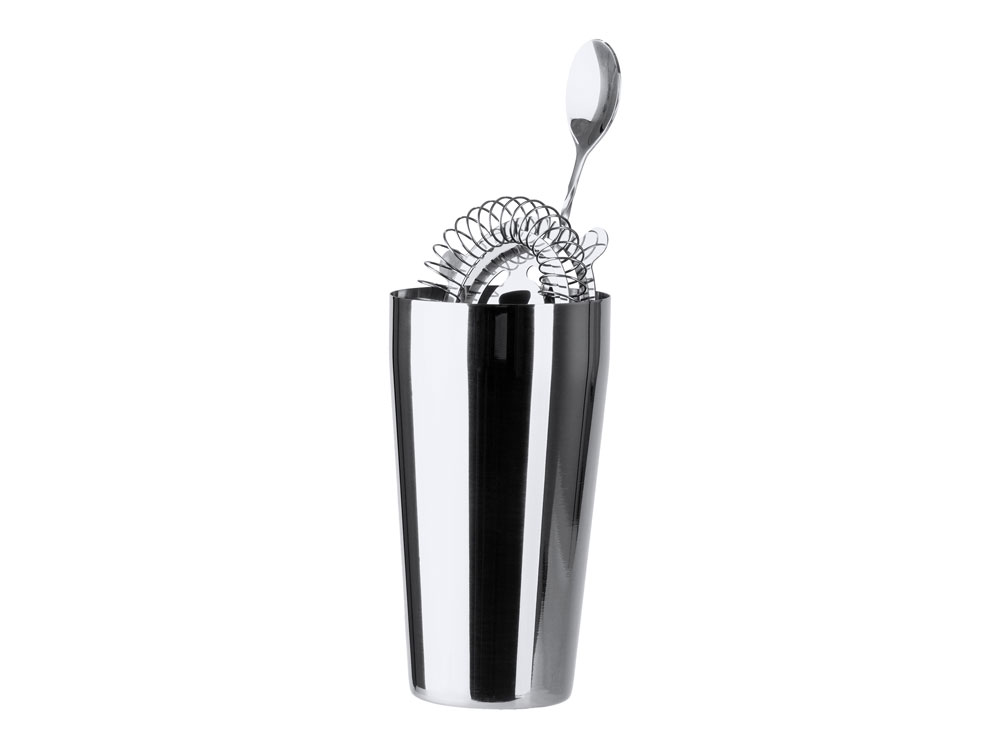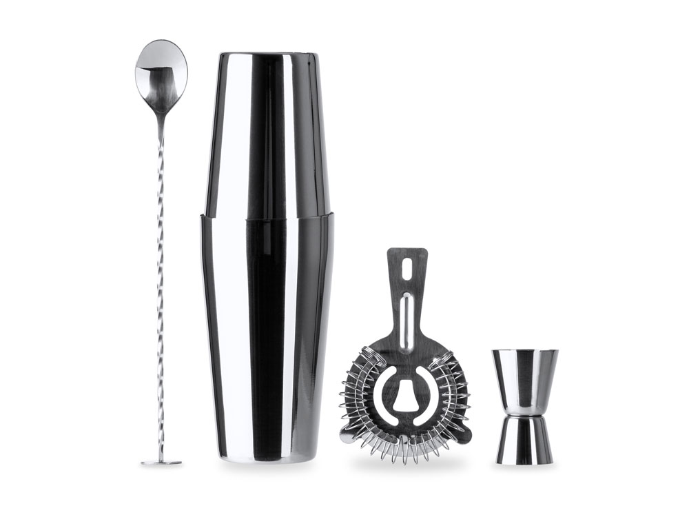 Набор для коктейлей из нержавеющей стали 304. Включает мерный стакан, шейкер на 580 мл, ситечко и ложку. Чехол для транспортировки в комплекте.