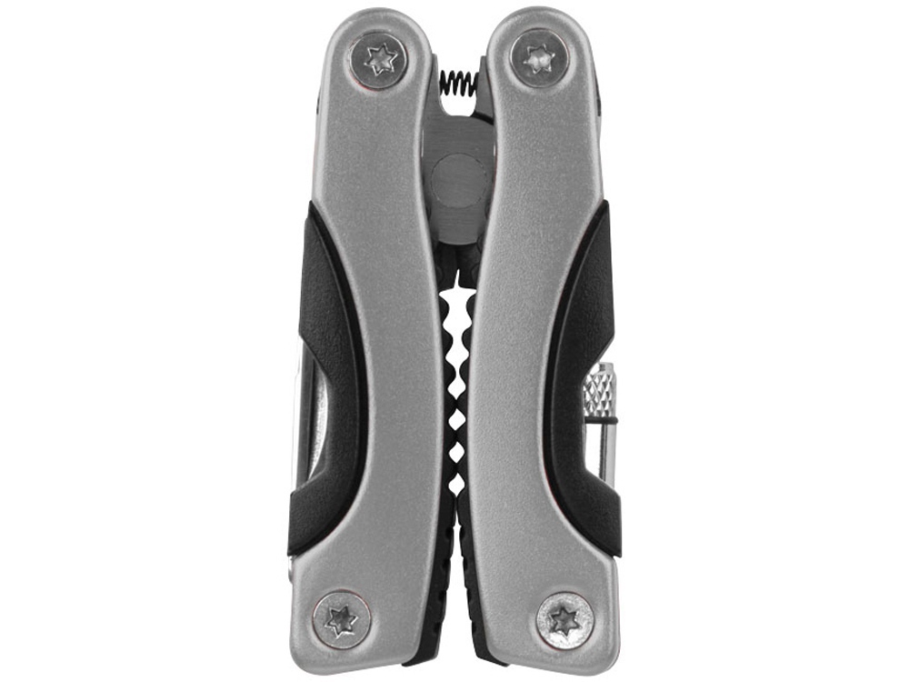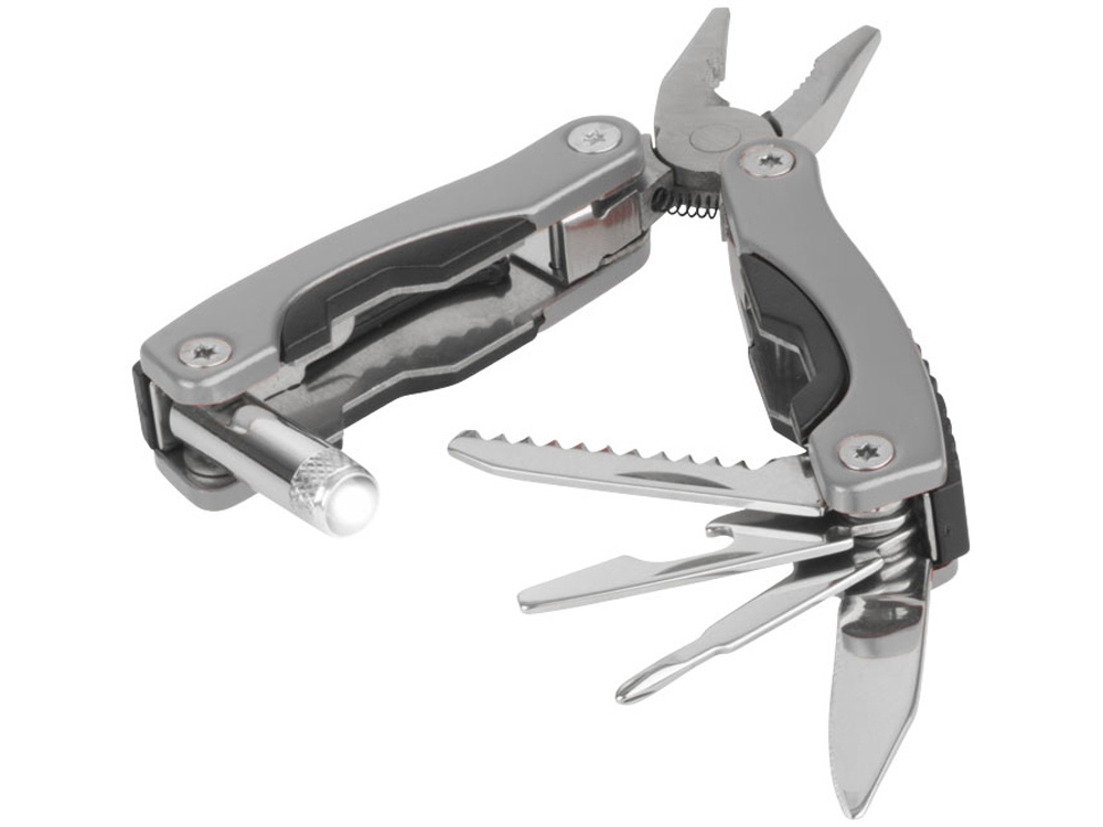 Мультиинструмент с диодным фонариком. В комплекте нейлоновый чехол с петелькой для крепления и застежкой на липучке. Батарейки в комплекте.