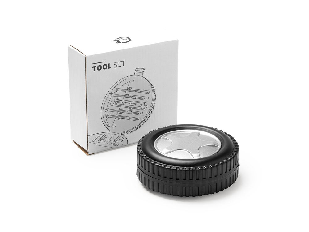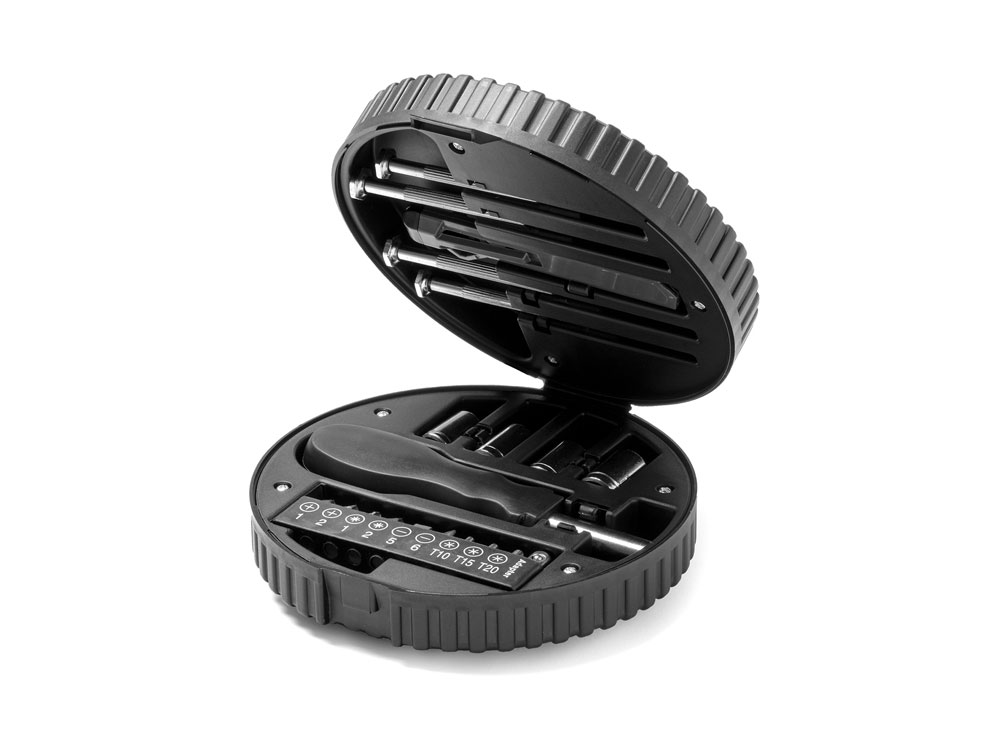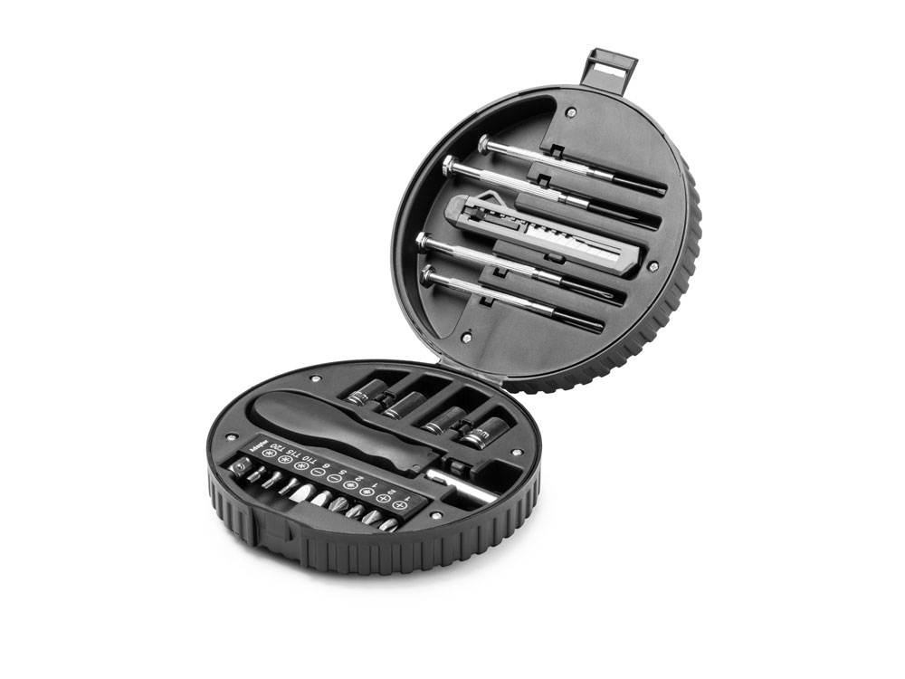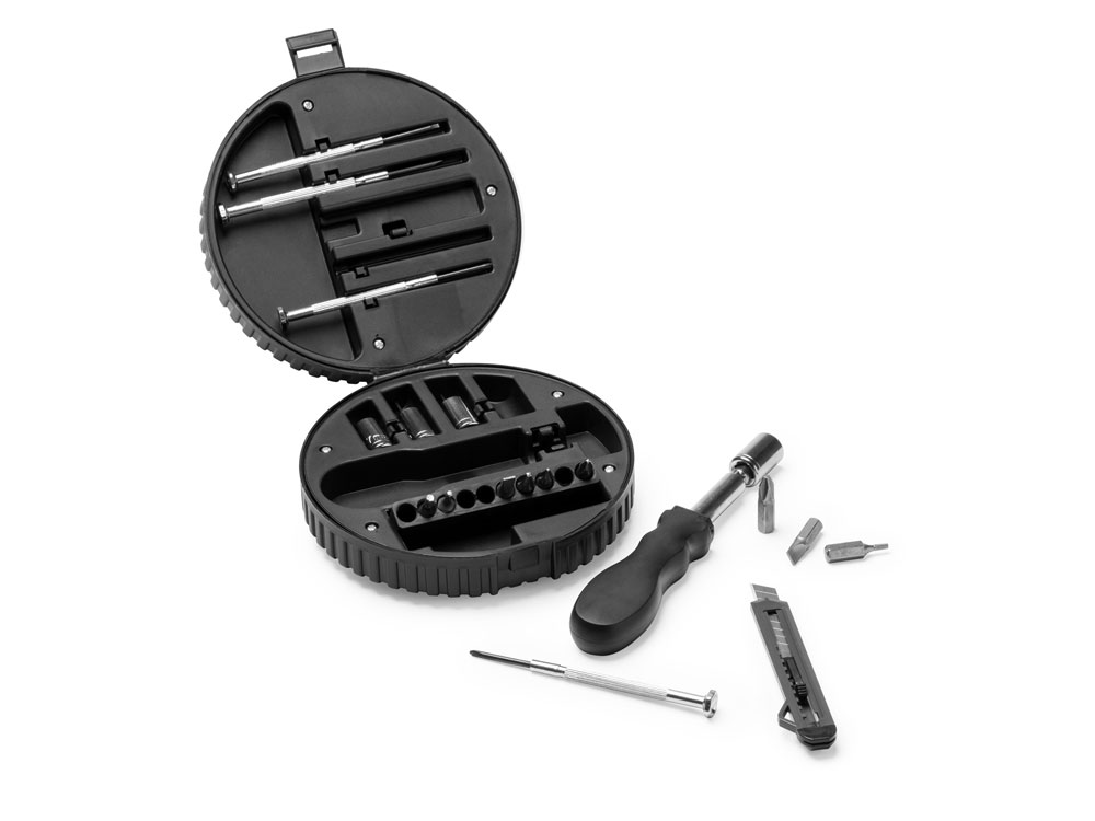 Набор из 25 инструментов включает измерительную мини рулетку, крестообразную отвертку, плоскую отвертку, 9 насадок с адаптером (4 крестообразных шлицев, 2 плоских шлица и 3 шестигранных шлица), 3 шестигранных ключа, 5 головок (5-9 мм), острогубцы, рукоятку отвертки, адаптер для насадок и удобный футляр. Тампопечать (1 цвет (цветные изделия)) на данный товар осуществляется бесплатно. Оплачивается только настройка оборудования в размере 8200 рублей на весь тираж.