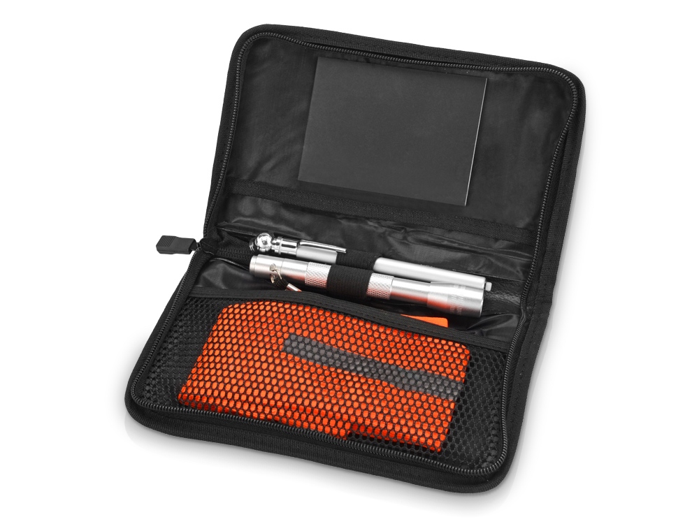 Дорожный набор Favorite пригодится в каждой машине. В автомобильный комплект входят такие полезные вещи как ручка, фонарик, прибор для измерения давления в шинах, блокнот, жилет со светоотражающими элементами. Гравировка (оптоволоконный лазер) (Без чернения) на данный товар осуществляется бесплатно. Оплачивается только настройка оборудования в размере 1100 рублей на весь тираж.
