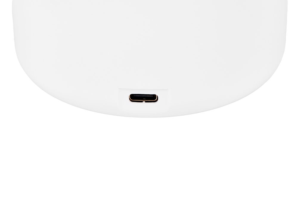 Ночник с RGB-подсветкой из 7 переливающихся цветов. Также есть режимы стандартного и яркого освещения теплым светом. Ночник выполняет функцию зарядной станции для устройств, поддерживающих беспроводную зарядку стандарта Qi мощностью 15 Вт*. Функция ночника работает без подключения к сети благодаря встроенному аккумулятору на 400 мАч. Функция беспроводной зарядки работает только при питании от сети. Устройство можно брендировать методом УФ-печати, тампопечати, а также цифровой печати.