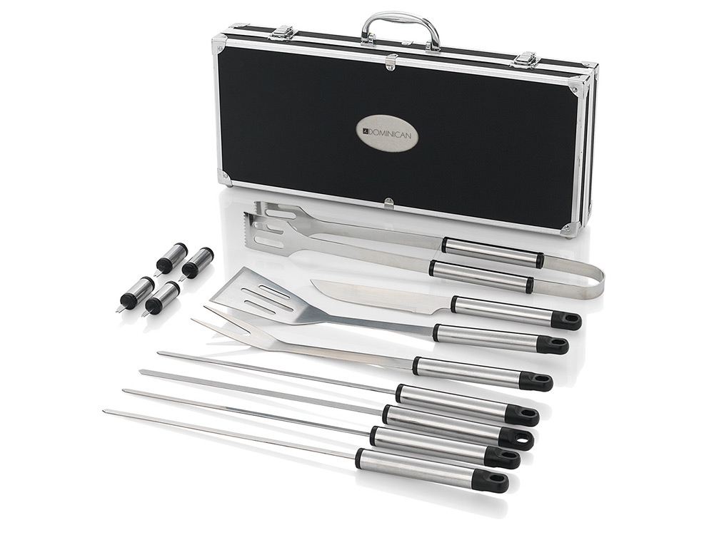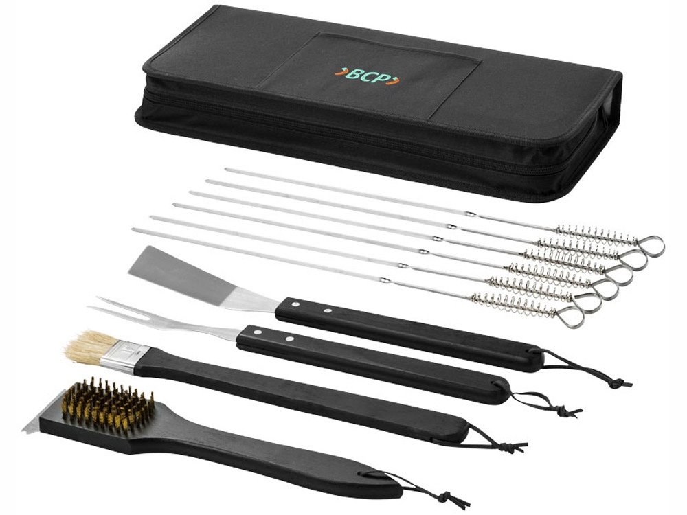 Набор для барбекю 12 предметов. 4 шампура, 4 шпажки для снятия шашлыка, нож, щипцы, вилка, лопатка. Шильд в комплекте 4,8 х 8,3 см. Гравировка (оптоволоконный лазер) (Без чернения) на данный товар осуществляется бесплатно. Оплачивается только настройка оборудования в размере 1100 рублей на весь тираж.