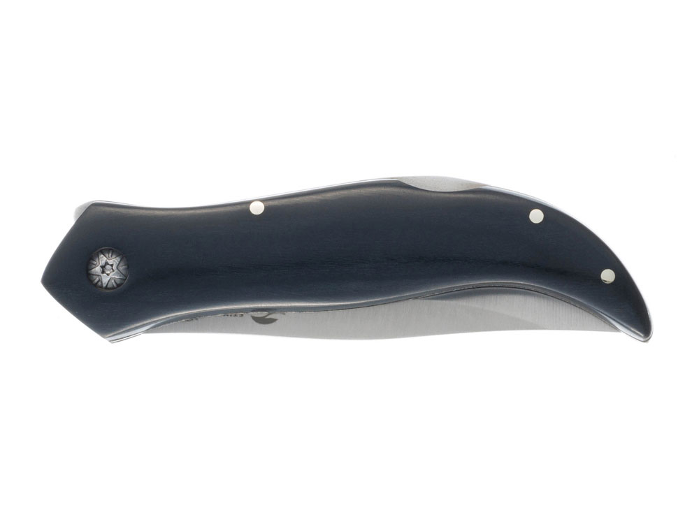 Складной нож из нержавеющей стали в сочетании с натуральным деревом. Нож оснащен системой безопасности.