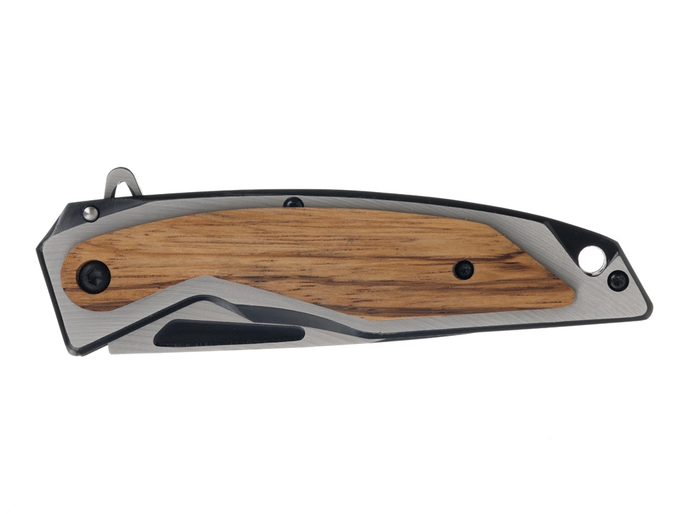 Рукоять ножа произведена из нержавеющей стали с накладками из древесины, собрана на втулках - бонках, поэтому при необходимости нож можно легко промыть. Нож быстро открывается при помощи флиппера с ассистом (механизм ускоренного открывания). На рукояти расположено отверстие для темляка и клипса для удобного размещения ножа в кармане.