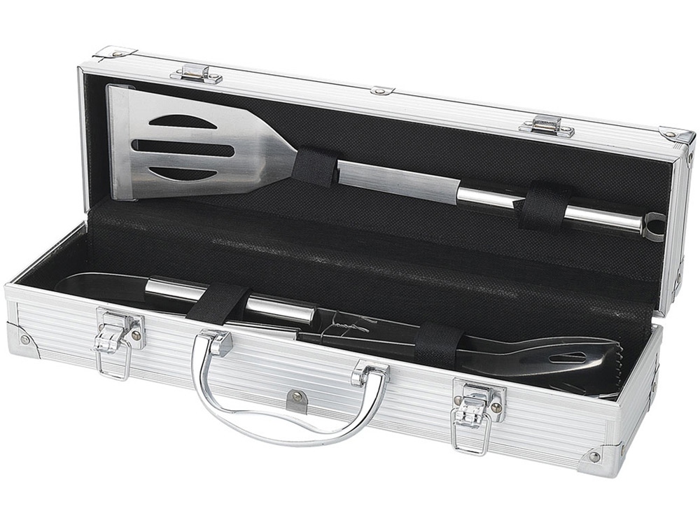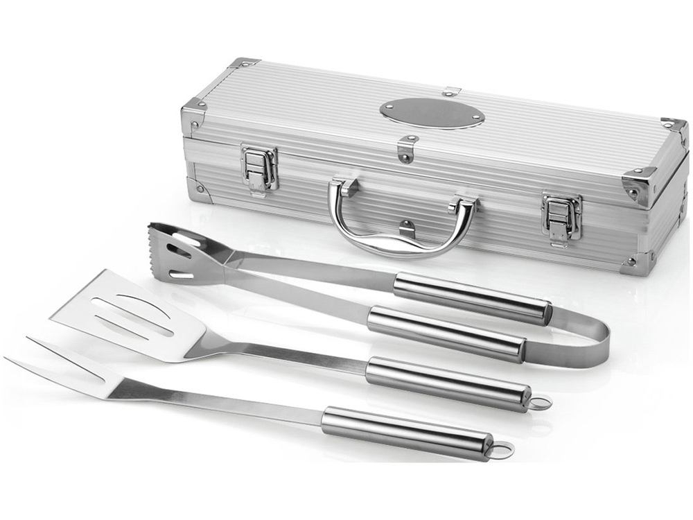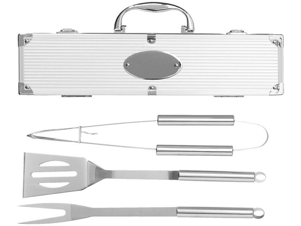 Набор для барбекю 3 предмета. Лопатка, щипцы и вилка в кейсе. На алюминиевом кейсе имеется шильд для персонализации. Гравировка (оптоволоконный лазер) (Без чернения) на данный товар осуществляется бесплатно. Оплачивается только настройка оборудования в размере 1100 рублей на весь тираж.