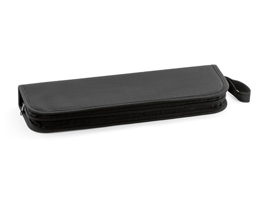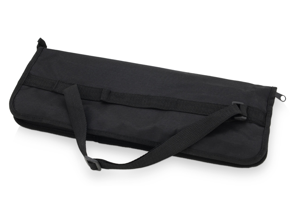Набор для барбекю Fabrizio состоит из ножа, лопатки, вилки, щипцов, четырех шампуров и восьми вилок для кукурузы, упакованный в чехол-книжку с ручками для переноски.