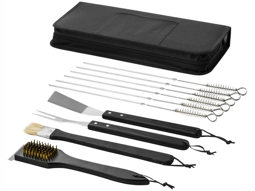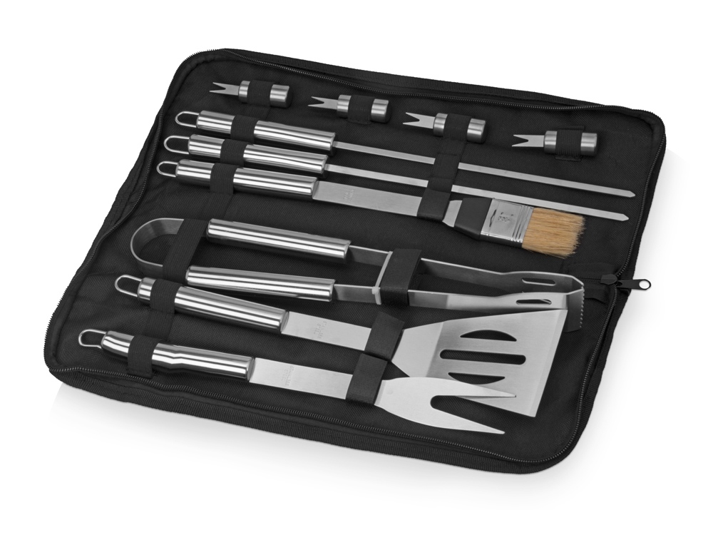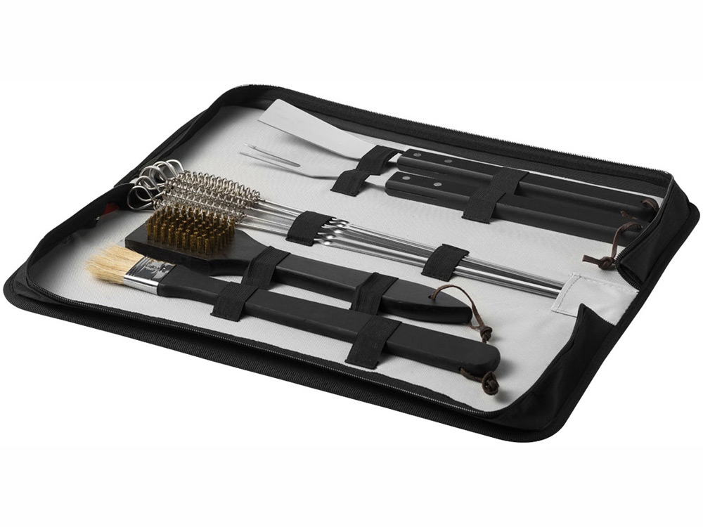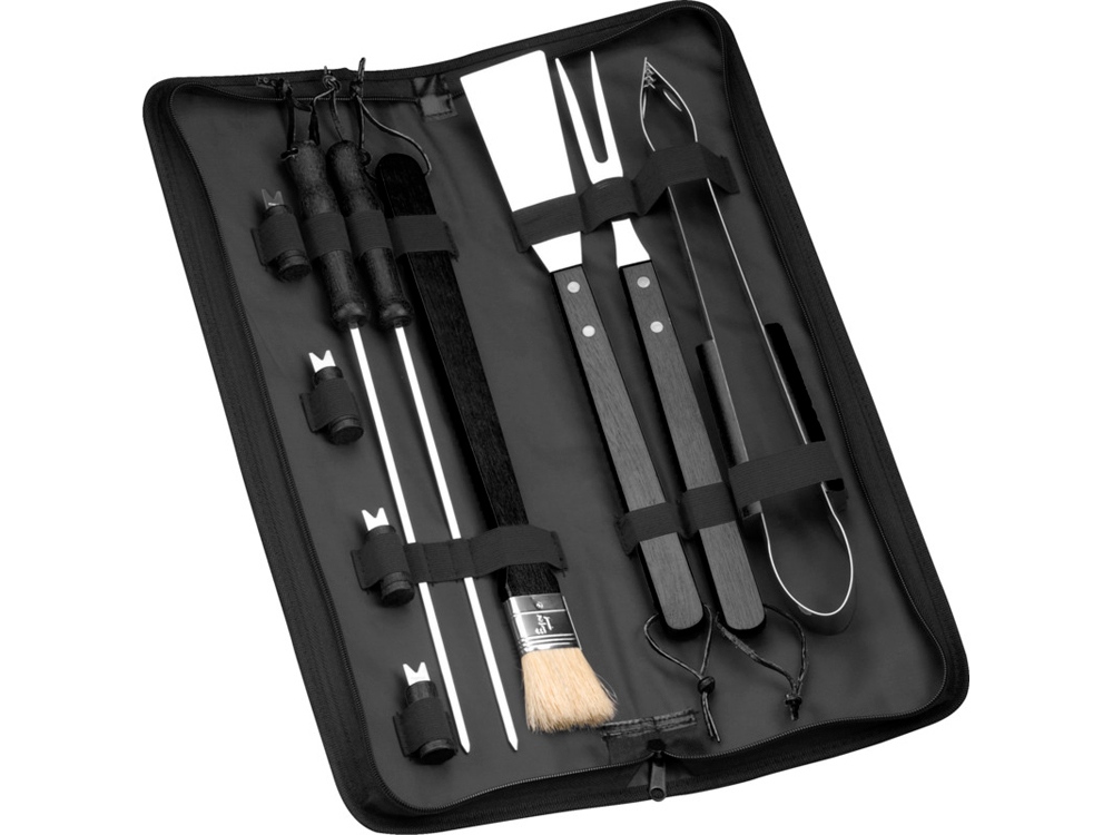в наличии 233 штНабор для барбекю Barabicu из 10 предметов. Чехол с застежкой на молнии, передним открытым карманом и двумя ручками, включая лопатку, вилку, щипцы, 2 шампура, кухонную кисть и 4 держателя для кукурузы. Гравировка (оптоволоконный лазер) (Без чернения) на данный товар осуществляется бесплатно. Оплачивается только настройка оборудования в размере 1100 рублей на весь тираж.