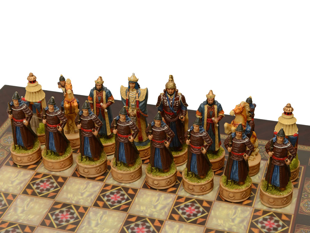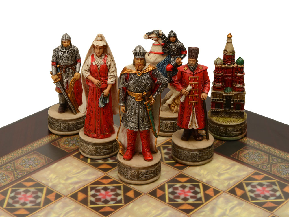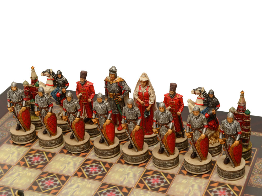 Шахматы в стиле времен Ивана Грозного станут необычным подарком любителям этой сложной и не терпящей спешки игры. Оформление фигур проработано до мелких деталей. К фигуркам прилагается доска для игры.