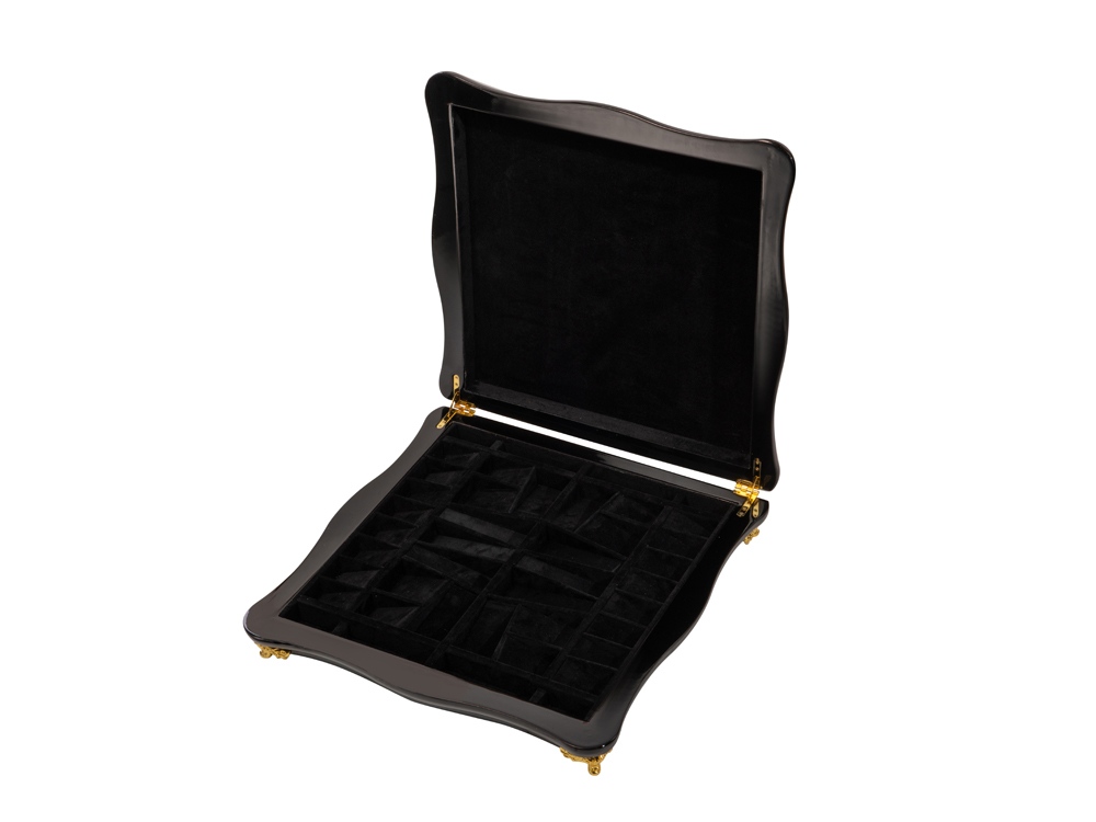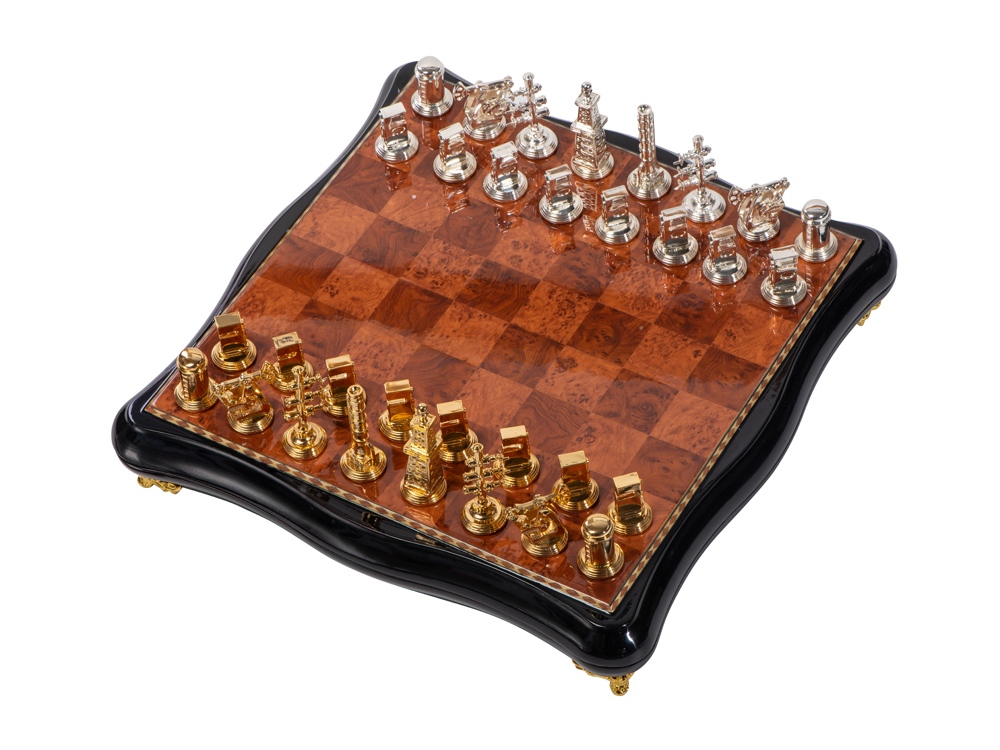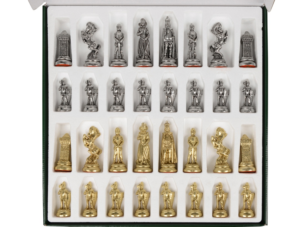 Фигурки выполнены в стилистике времен и изготовлены из цинкового сплава замак с посеребрением и позолочением. Шахматная доска представляет собой фрагмент цельного каучукового дерева. Игровое поле 41 х 41 см. Набор упакован в две картонные коробки. На оборотной стороне шахматной доски имеется бархатное покрытие и углубления, в которые можно складывать фигуры. Окунитесь в старинную эпоху Карла IV вместе с нашим эксклюзивным подарком.
