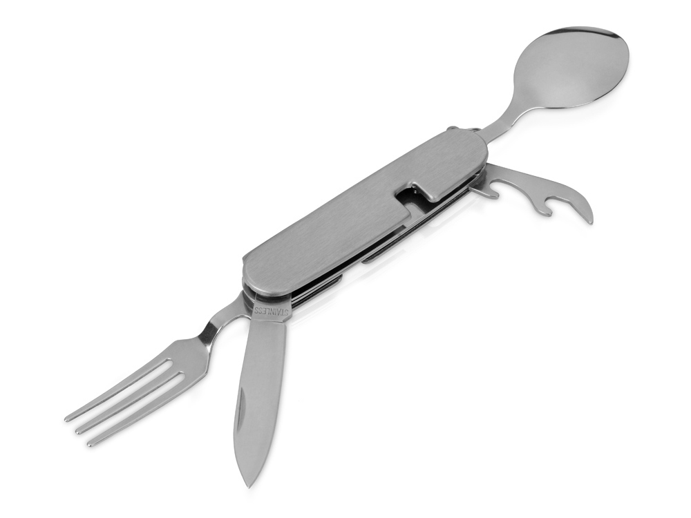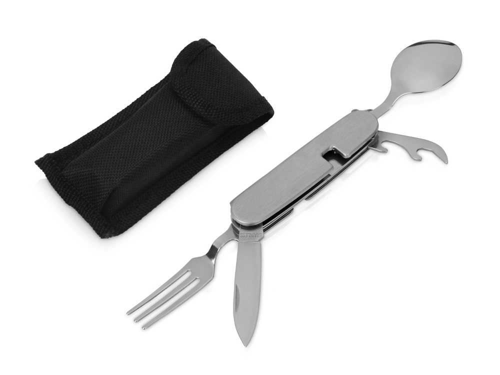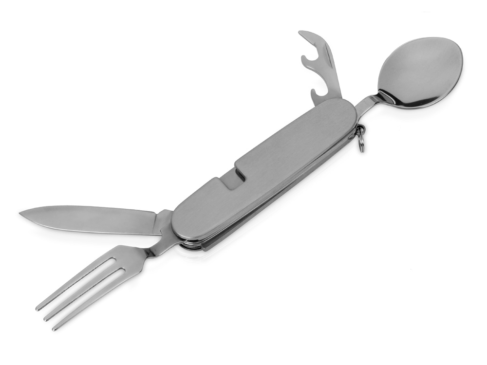 В нем есть все, что необходимо - ложка, вилка, ножик, открывалка бутылок и жестяных банок. Также имеется удобное кольцо для подвешивания. Набор разделяется на две части.