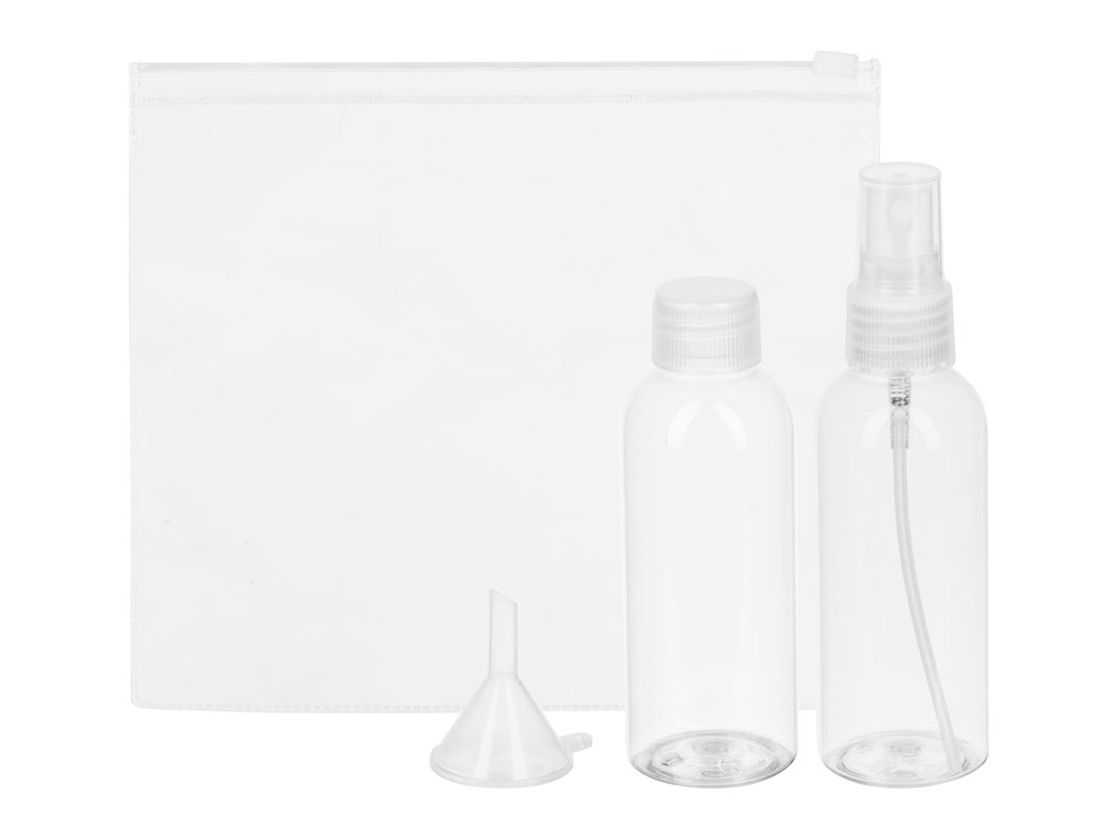 Собирая чемодан, мы всегда стремимся уменьшить вес и объем дорожной сумки. Дорожный набор Mardid в этом деле первый помощник. В набор входят три бутылки, объемом в 80 мл., 1 бутылка-спрей и мини-воронка. В эти бутылочки легко перелить необходимые косметические средства, чтобы не тащить с собой целый флакон. Упакован в прозрачную пластиковую косметичку на застежке Zip-lock. Тампопечать (1 цвет (цветные изделия)) на данный товар осуществляется бесплатно. Оплачивается только настройка оборудования в размере 8200 рублей на весь тираж.
