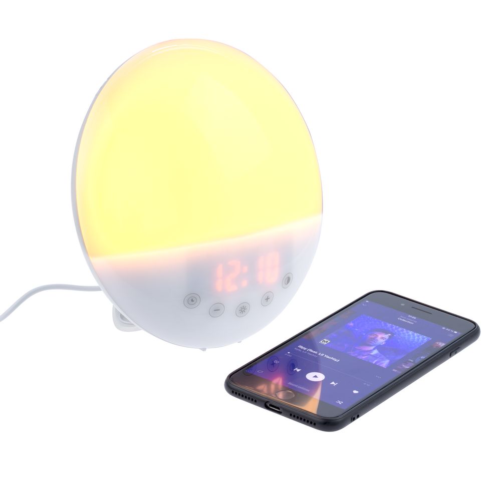 За 30 минут до звонка будильника активируется подсветка и ее яркость постепенно увеличивается — свет медленно выводит организм из фазы глубокого сна и вы будто встаете «с первыми лучами солнца». Эффект мягкого пробуждения можно дополнить натуральными звуками природы.