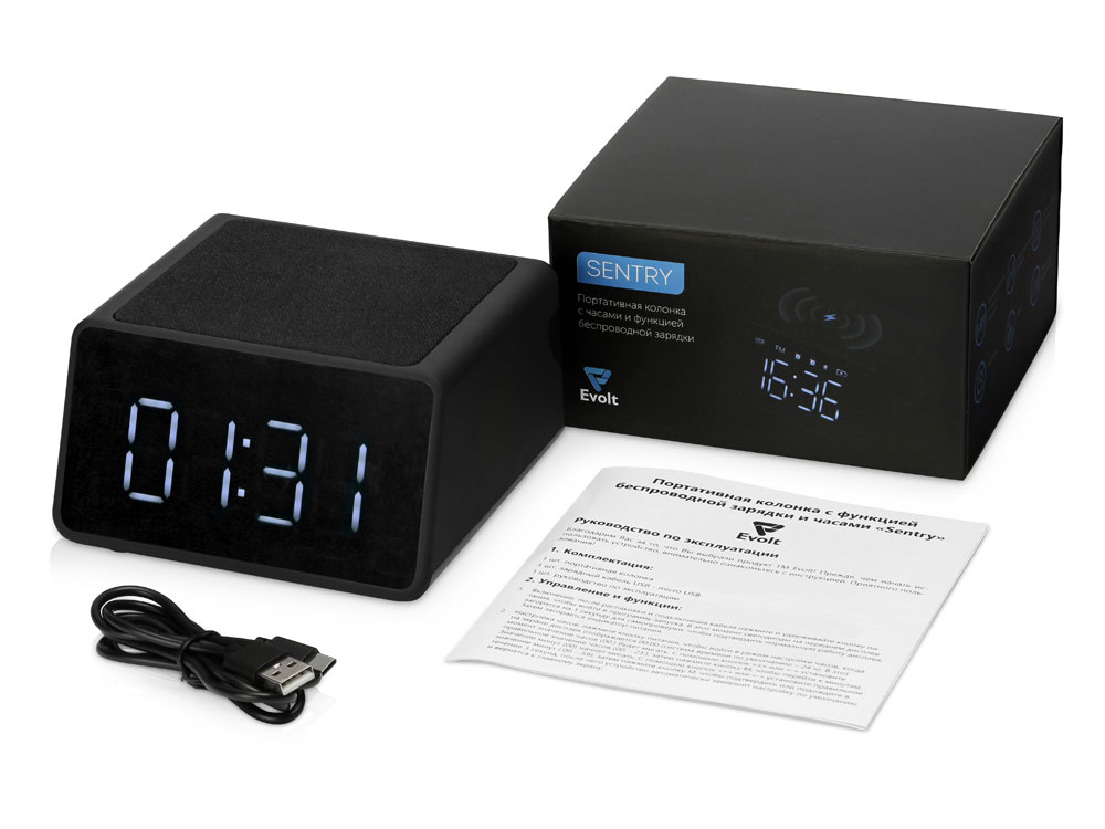 Беспроводная колонка с часами и функцией беспроводной зарядки Sentry от Evolt. Устройство может работать автономно, что позволяет использовать его в любой точке квартиры и за ее пределами и избавиться от проводов на рабочем столе. Колонка подключается к смартфону при помощи Bluetooth, имеет большой динамик, занимающий собой всю нижнюю панель Sentry.