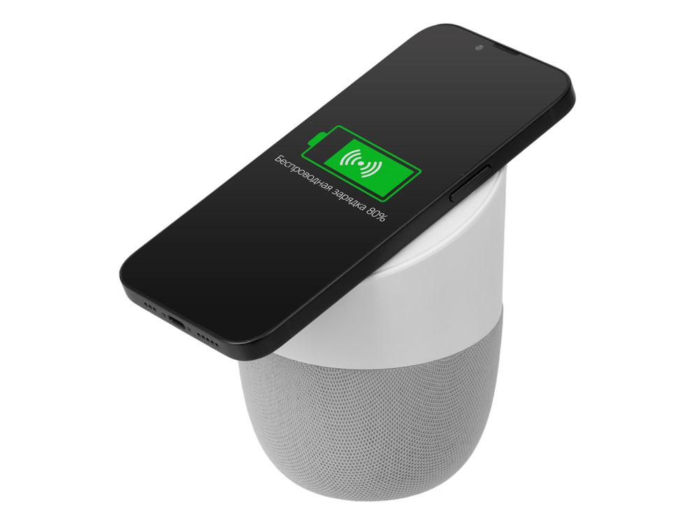 • беспроводная зарядка смартфона* Беспроводная зарядка работает при подключенном к колонке зарядном кабеле. Тампопечать (1 цвет (белые изделия)) на данный товар осуществляется бесплатно. Оплачивается только настройка оборудования в размере 7300 рублей на весь тираж.