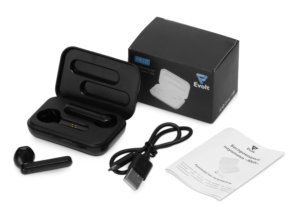 Беспроводные наушники Mels бренда Evolt обеспечивают до 16 часов суммарного воспроизведения музыки и работают на расстоянии до 10 метров от сопряженного с ним смартфона или иного гаджета. Зарядный чехол имеет разъем mini USB, внутри которого есть шкала заряда, состоящая из четырех делений.