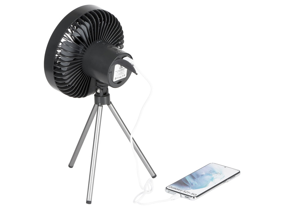 Ещё одна незаменимая функция для кэмпинга - возможность заряжать от вентилятора другие устройства (как от пауэрбанка), мощность аккумулятора - 3600 мА/ч.- три режима ночника и обдува;