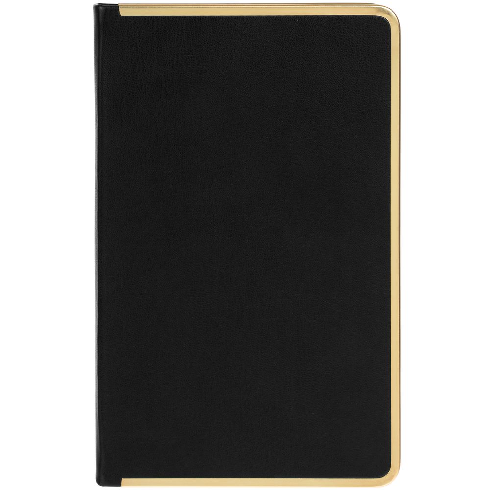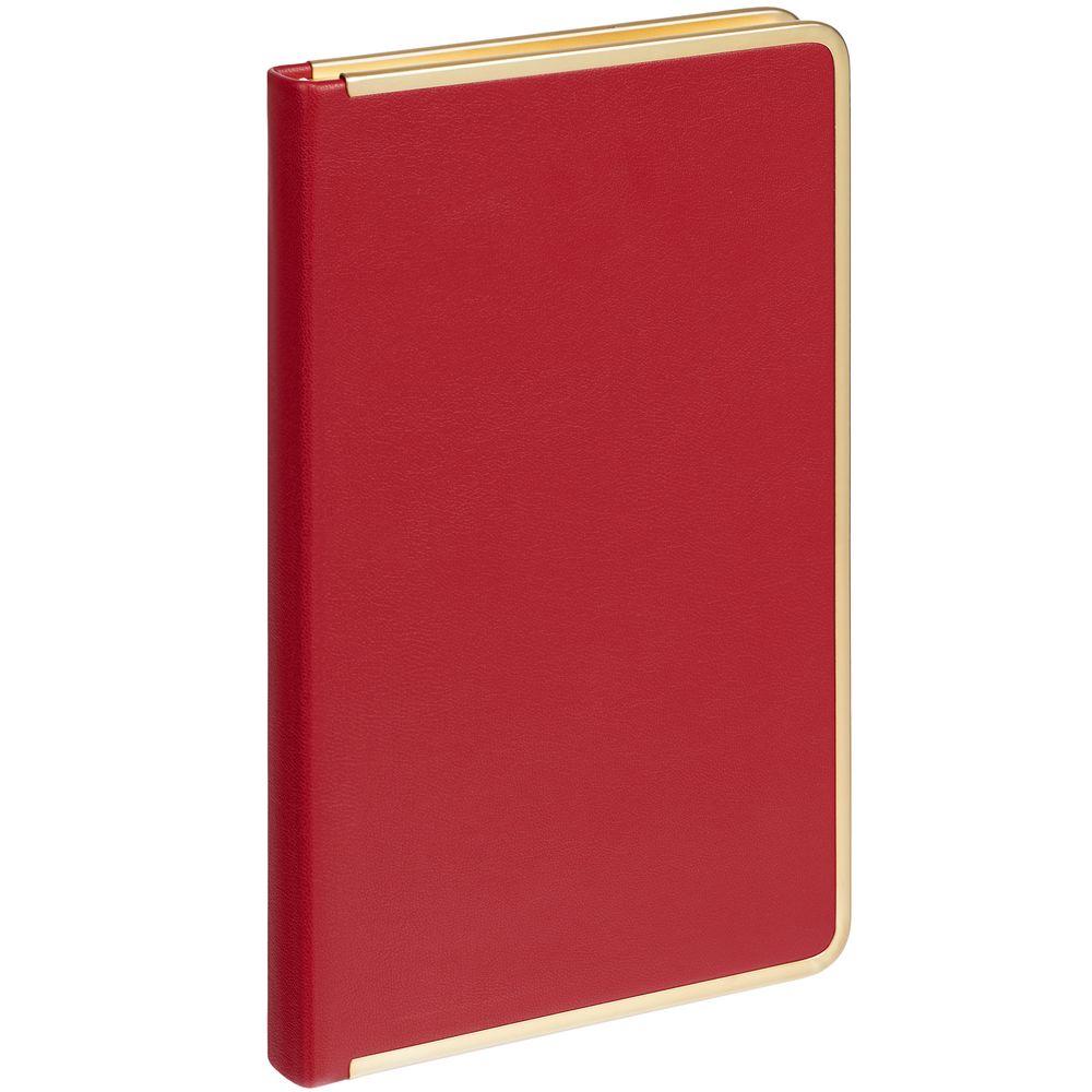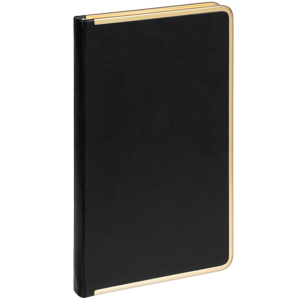 Изящный ежедневник с зауженным блоком и стильными деталями — металлической окантовкой на обложке и металлизированным обрезом.