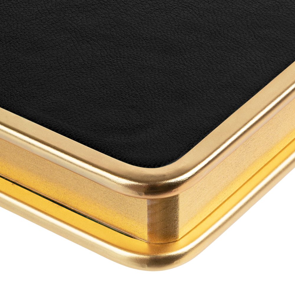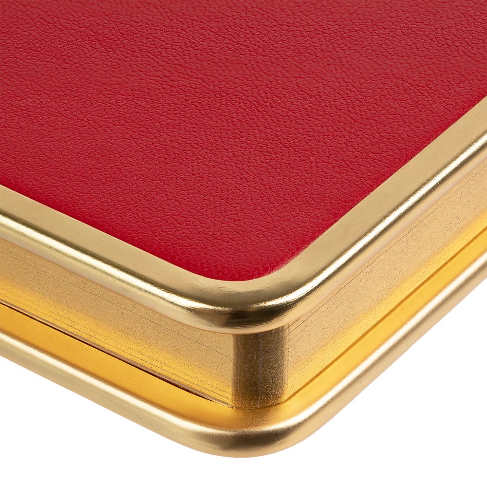 Твердая обложка с металлической окантовкой. Металлизированный обрез блока.