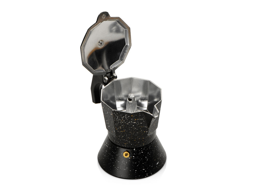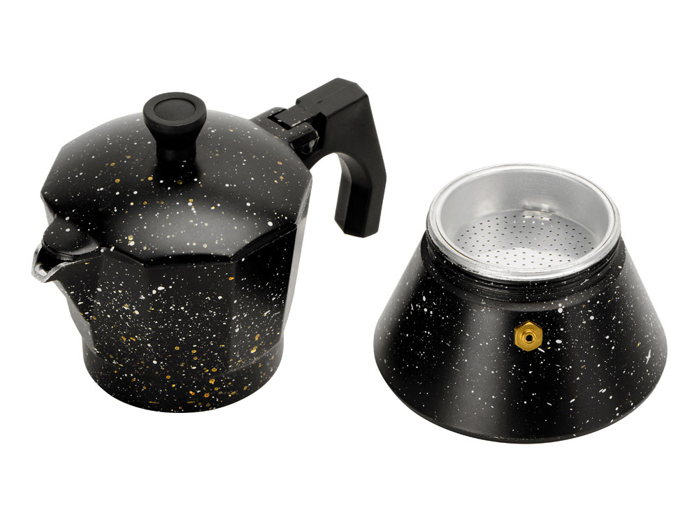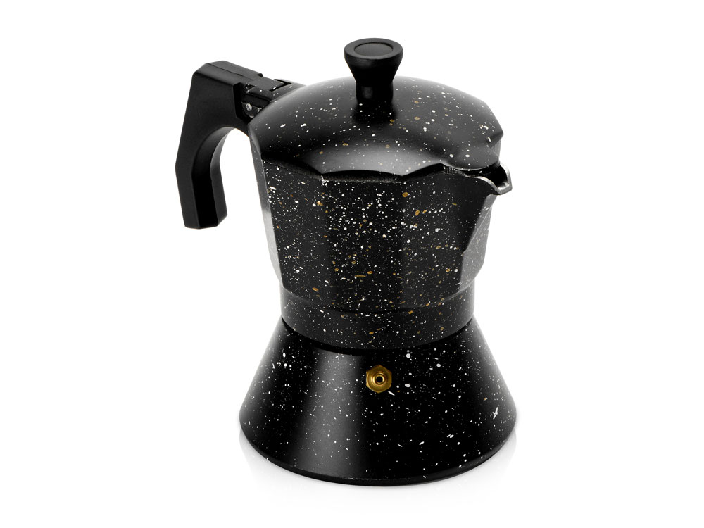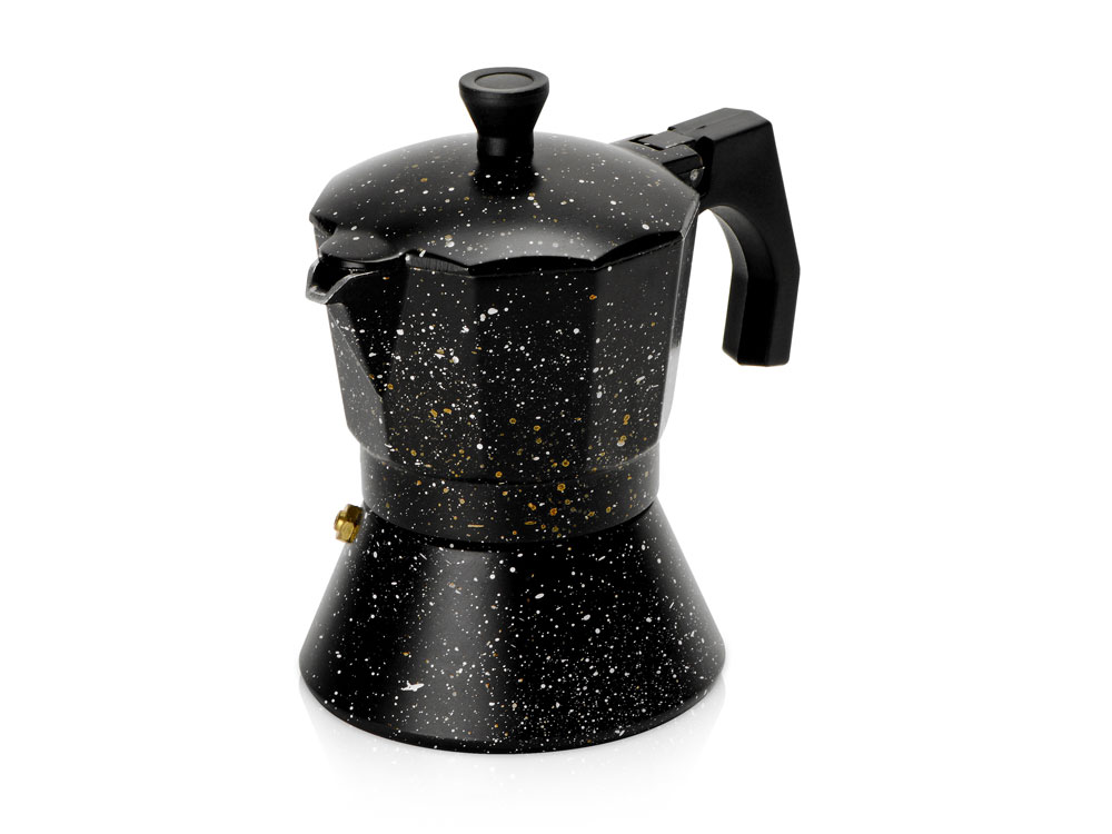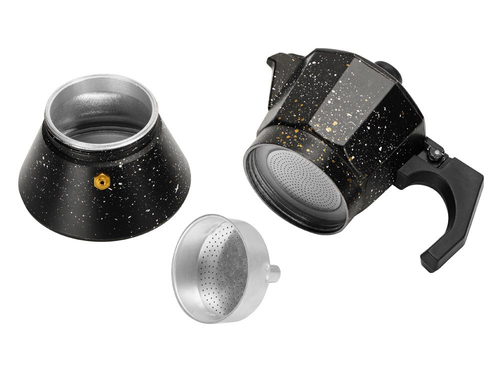 Верхний резервуар этой гейзерной кофеварки выполнен из алюминия, нижний — из высококачественной нержавеющей стали 430 марки, которая обеспечивает модели совместимость со всеми видами плит, включая индукционные. При помощи этой гейзерной кофеварки вы сможете приготовить эспрессо и напитки на его основе.