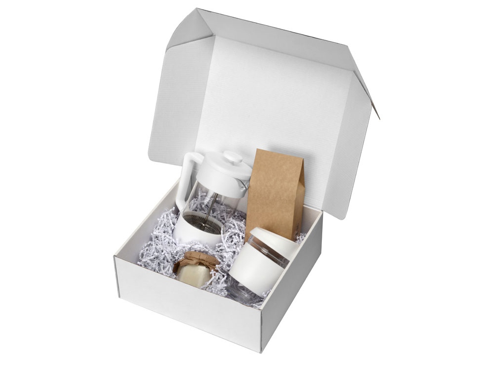 Набор Бодрое утро содержит все необходимое для действительно приятного пробуждения. В нем вы найдете все, что нужно для приготовления вашей первой чашечки кофе с утра: френч-пресс, упаковку робусты темной обжарки, стакан с силиконовыми деталями и баночку крем-меда, который составит прекрасную пару крепкому напитку. Набор упакован в белую картонную коробку и переложен бумажным наполнителем. Гравировка (CO2 лазер) (Без чернения) на данный товар осуществляется бесплатно. Оплачивается только настройка оборудования в размере 1100 рублей на весь тираж.