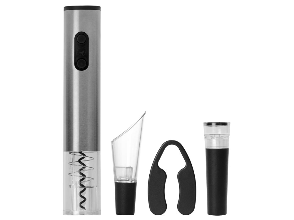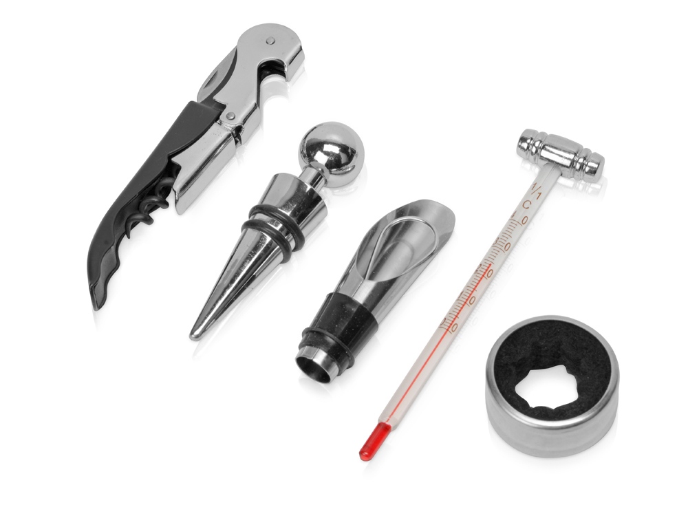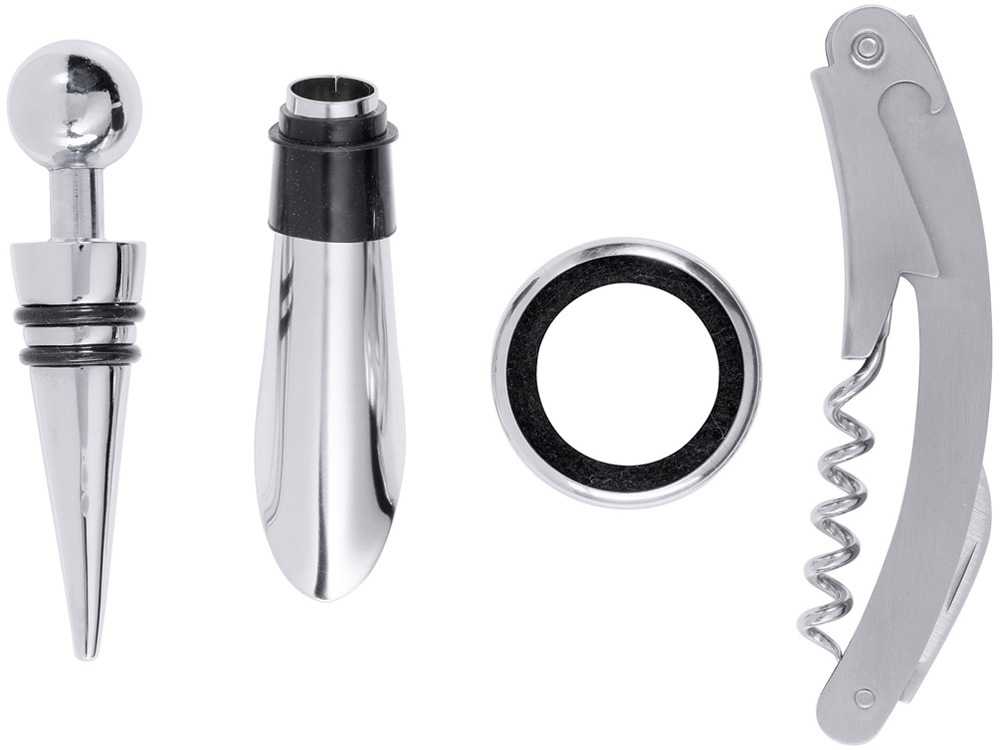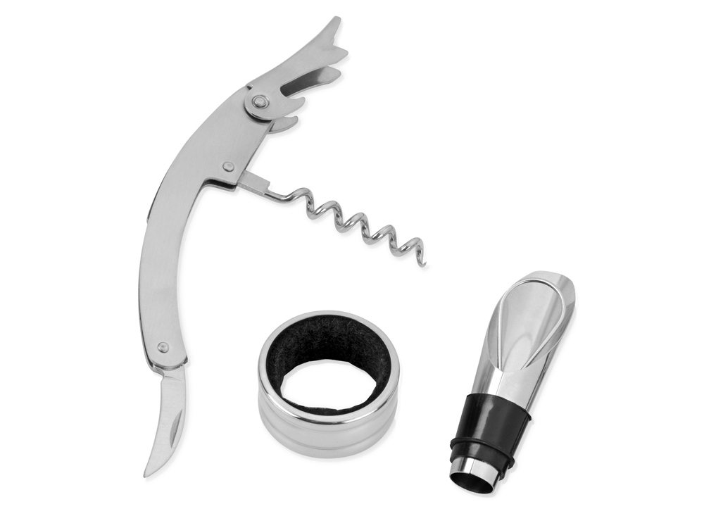 Винный набор с аксессуарами из нержавеющей стали, штопор с резаком для фольги, каплеуловитель, пробка и дозатор. Гравировка (оптоволоконный лазер) (Без чернения) на данный товар осуществляется бесплатно. Оплачивается только настройка оборудования в размере 1100 рублей на весь тираж.
