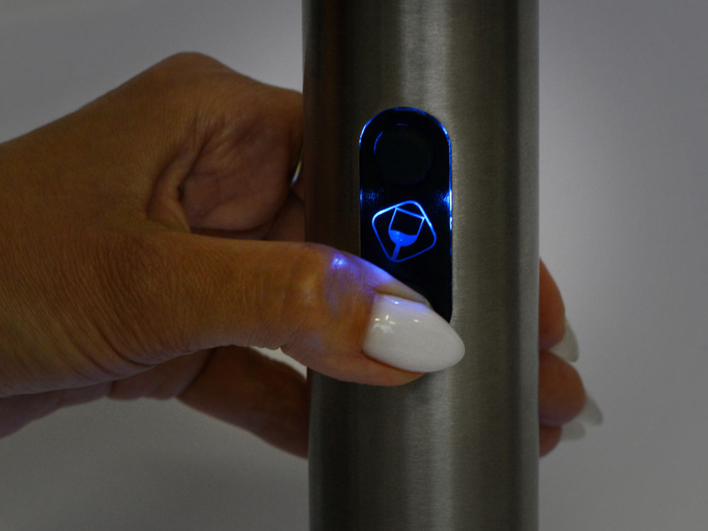 Штопор работает на батарейках АА (4 штуки) и при работе подсвечивается синим, что прекрасно видно сквозь прозрачную нижнюю часть — превратите подготовку вина в настоящее зрелище! От вас не требуется никаких усилий: просто правильно разместите штопор поверх горлышка и нажмите кнопку, а если процесс не кажется вам очевидным — поможет инструкция, которая приложена к набору.