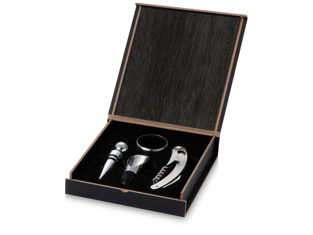 в наличии 7 штВинный набор с аксессуарами из нержавеющей стали, штопор с резаком для фольги, каплеуловитель, пробка и дозатор. Гравировка (оптоволоконный лазер) (Без чернения) на данный товар осуществляется бесплатно. Оплачивается только настройка оборудования в размере 1100 рублей на весь тираж.
