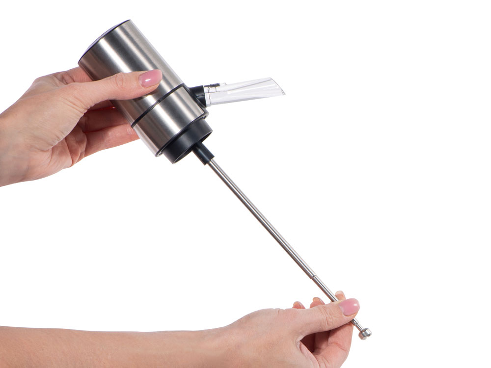 5. подставьте бокал под акриловую прозрачную трубку и нажмите на кнопку. Готово!Для промывки аэратора наполните бутылку чистой водой и прогоните весь объем через устройство.