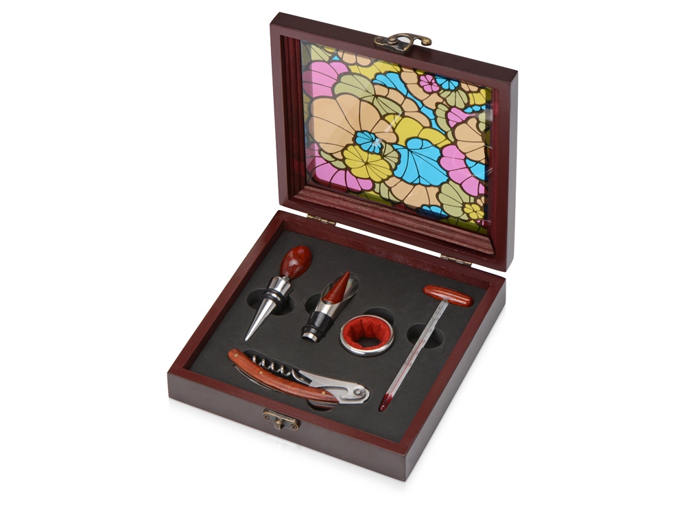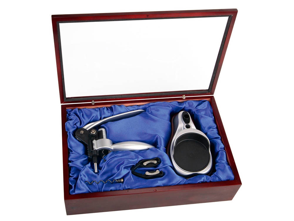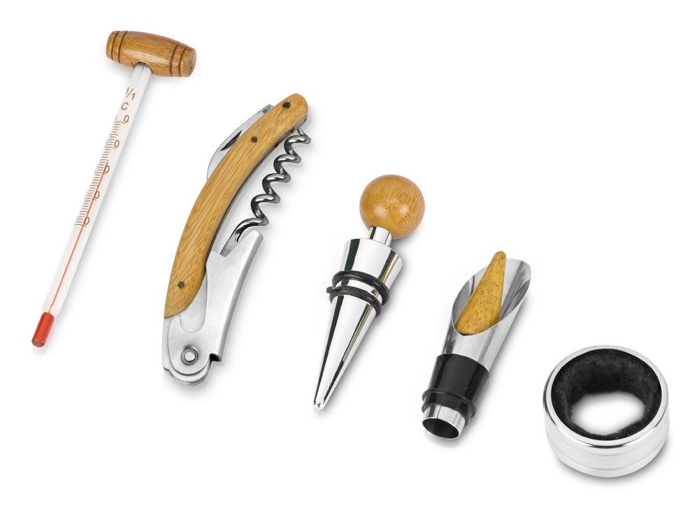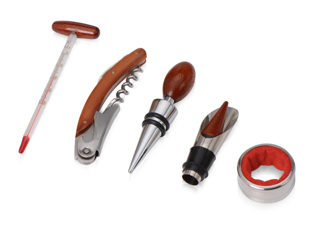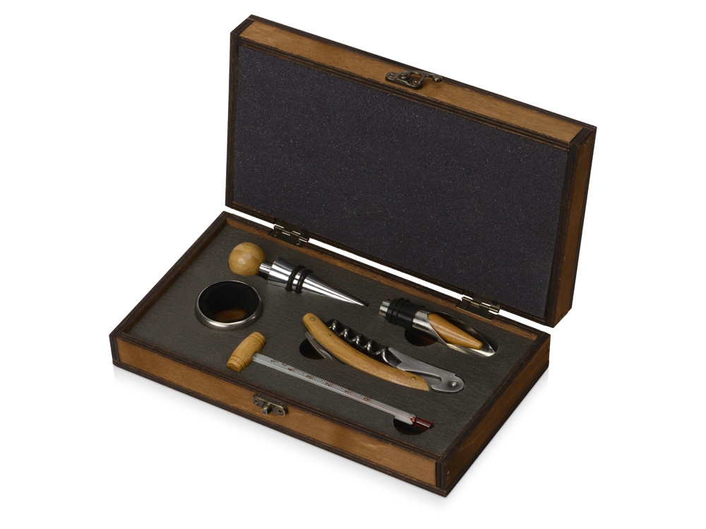 В набор аксессуаров для вина входят штопор-открывалка, воротничок на бутылку, пробка для бутылки и даже термометр. Набор поставляется в презентабельном деревянном футляре. Гравировка (оптоволоконный лазер) (Без чернения) на данный товар осуществляется бесплатно. Оплачивается только настройка оборудования в размере 1100 рублей на весь тираж.