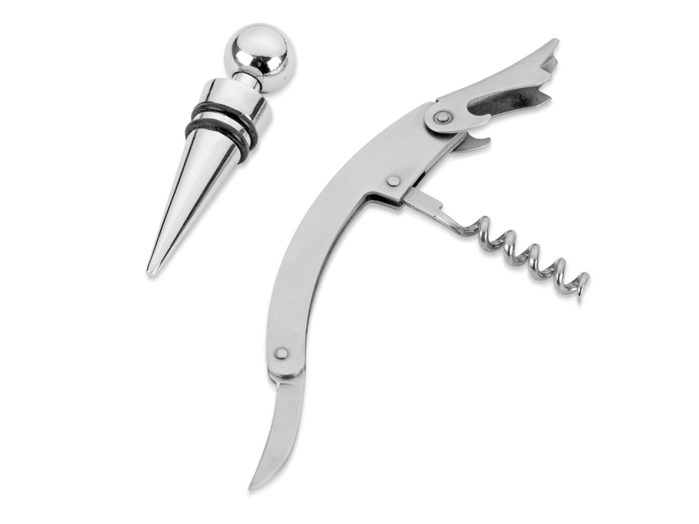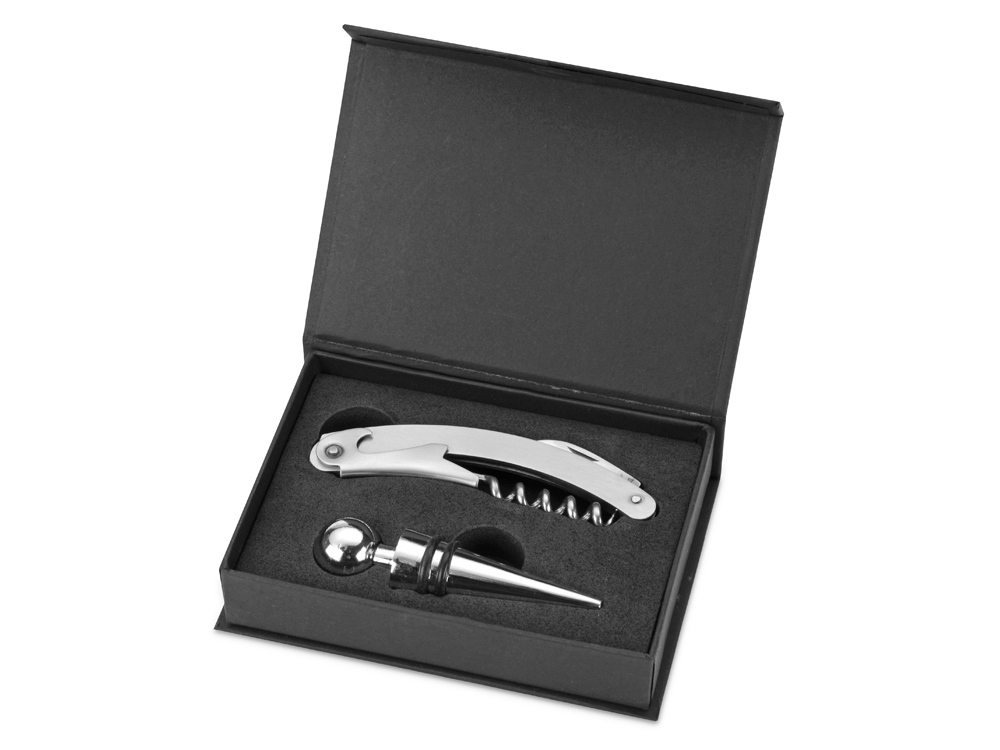 в наличии 7 штВинный набор с аксессуарами из нержавеющей стали, штопор с резаком для фольги, каплеуловитель, пробка и дозатор. Гравировка (оптоволоконный лазер) (Без чернения) на данный товар осуществляется бесплатно. Оплачивается только настройка оборудования в размере 1100 рублей на весь тираж.