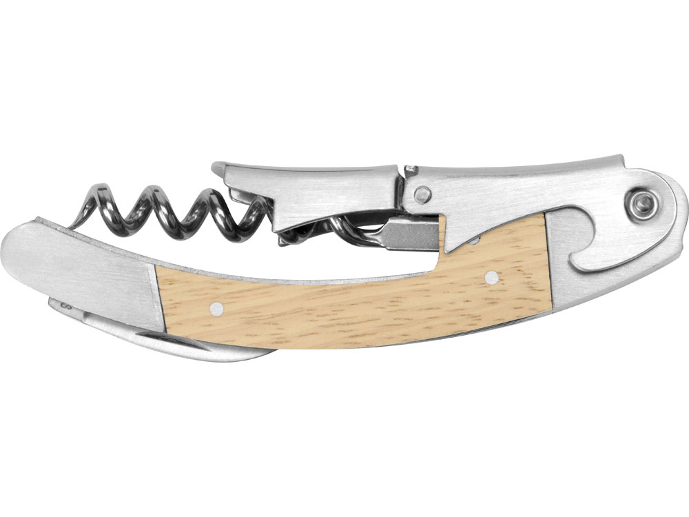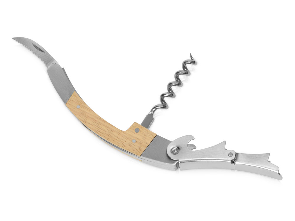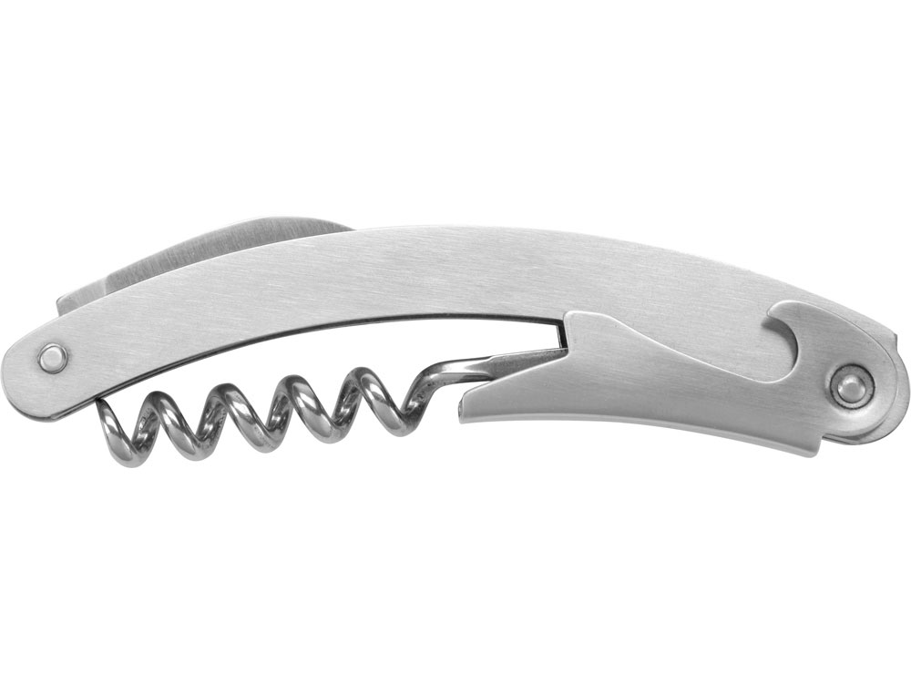 Штопор с буравчиком, открывалкой для бутылок и ножом для срезания фольги. Нержавеющая сталь. Гравировка (оптоволоконный лазер) (Без чернения) на данный товар осуществляется бесплатно. Оплачивается только настройка оборудования в размере 1100 рублей на весь тираж.