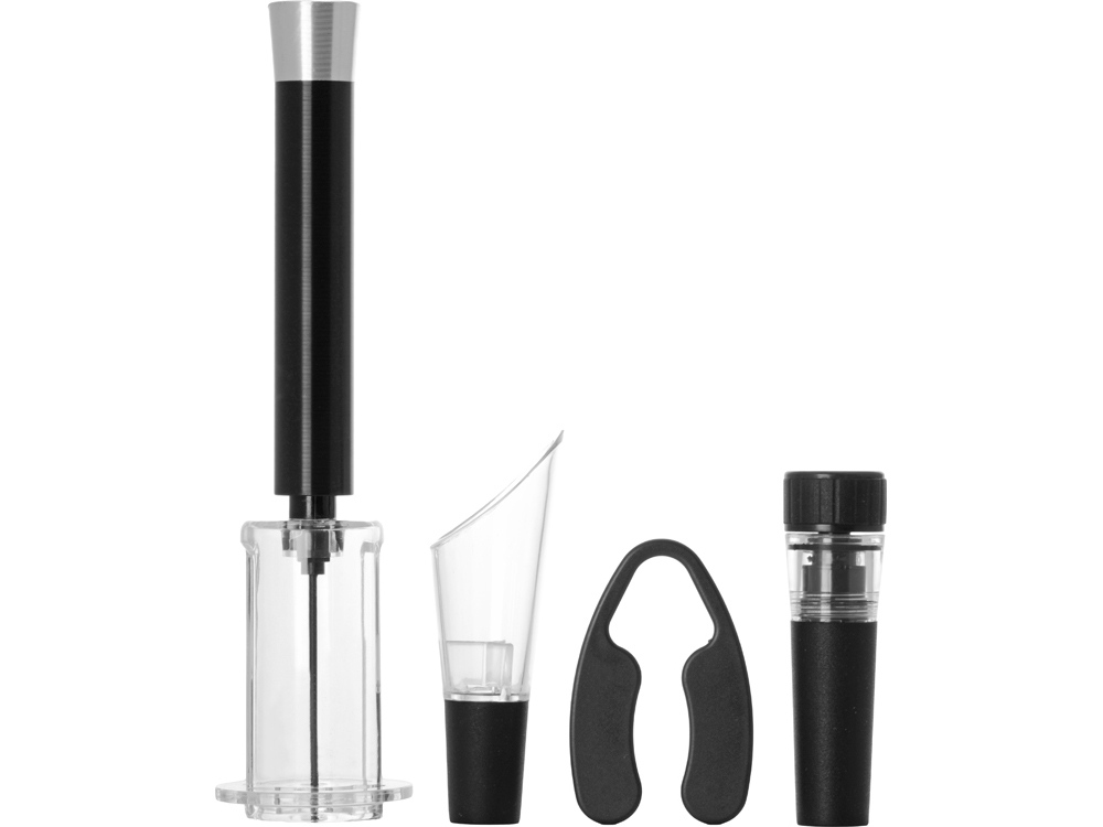 Набор винных аксессуаров состоит из воронки-аэратора, пробки, каплеуловителя и штопора. Металлические детали выполнены из нержавеющей стали, устойчивой к коррозии, также использованы силиконовая резина и АБС-пластик, абсолютно безопасный для человека.