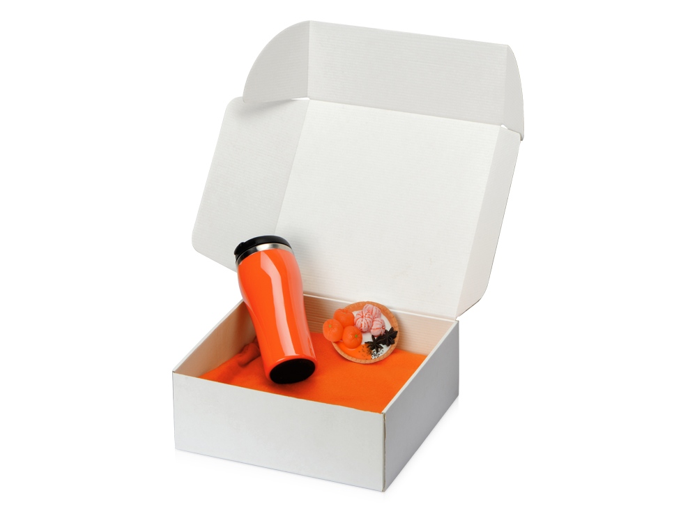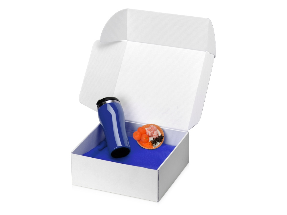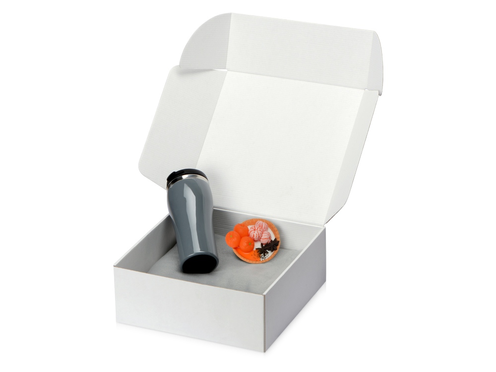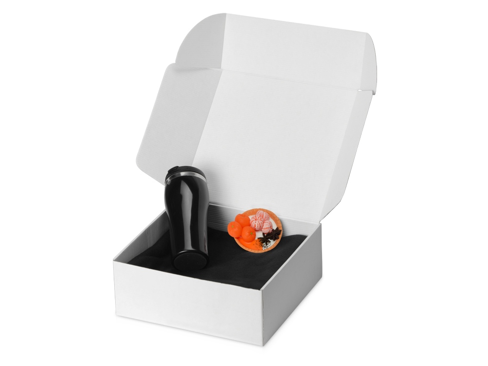 Плед, термокружка и мыло ручной работы упакованы в белую картонную коробку с наполнителем. Мыло ручной работы в виде тарталетки с мандаринами добавляет набору вкусную нотку, а термокружка и плед — станут согревающим уютным подарком. Трафаретная печать круговая (1 цвет (белые изделия)) на данный товар осуществляется бесплатно. Оплачивается только настройка оборудования в размере 6400 рублей на весь тираж.