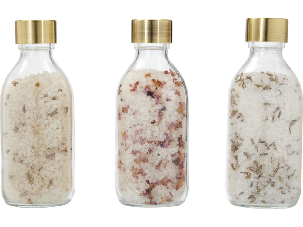 Подарочный набор Just Relax из 3 видов соли для ванны из Мертвого моря объемом 200 мл в бутылках из прозрачного стекла со стальным колпачком, покрытым латунью. В наборе предлагается три популярных аромата: роза, лаванда и ромашка.
