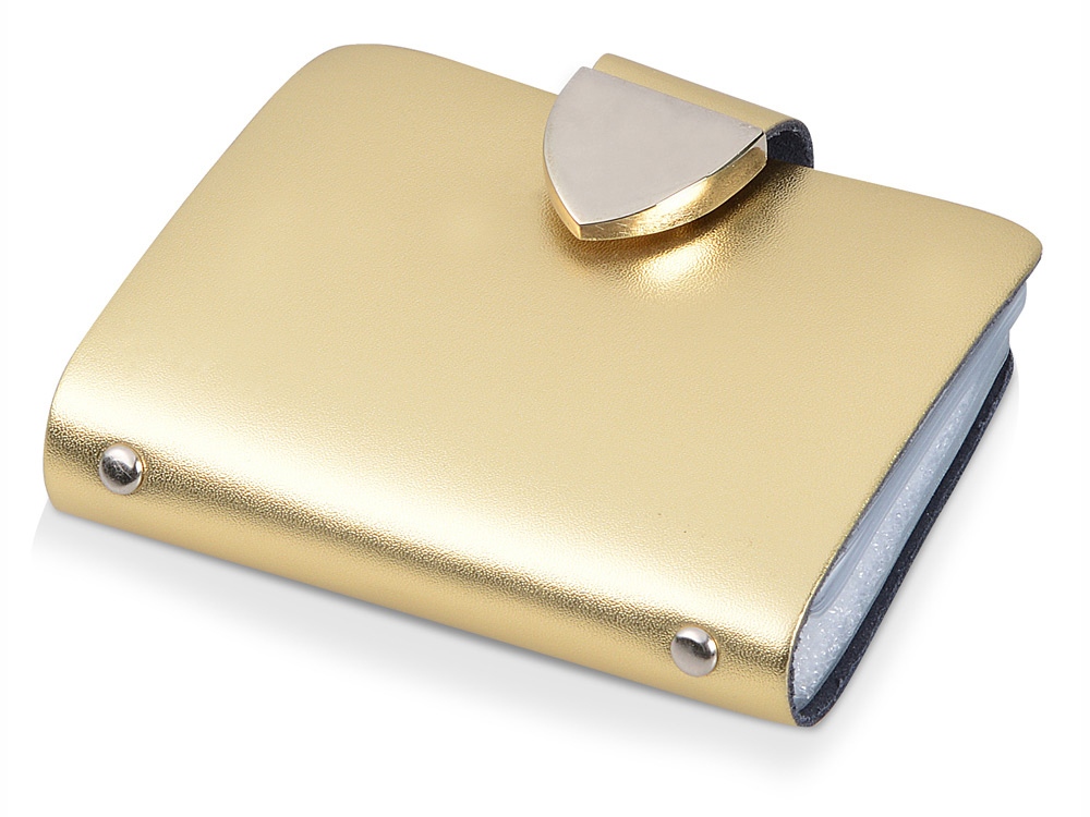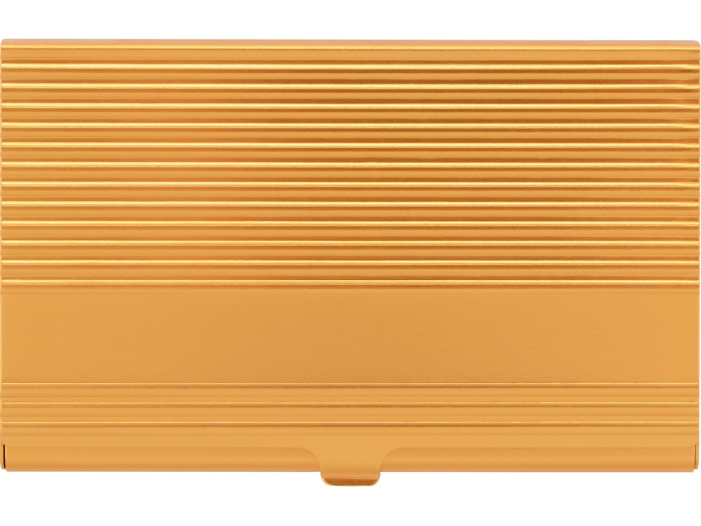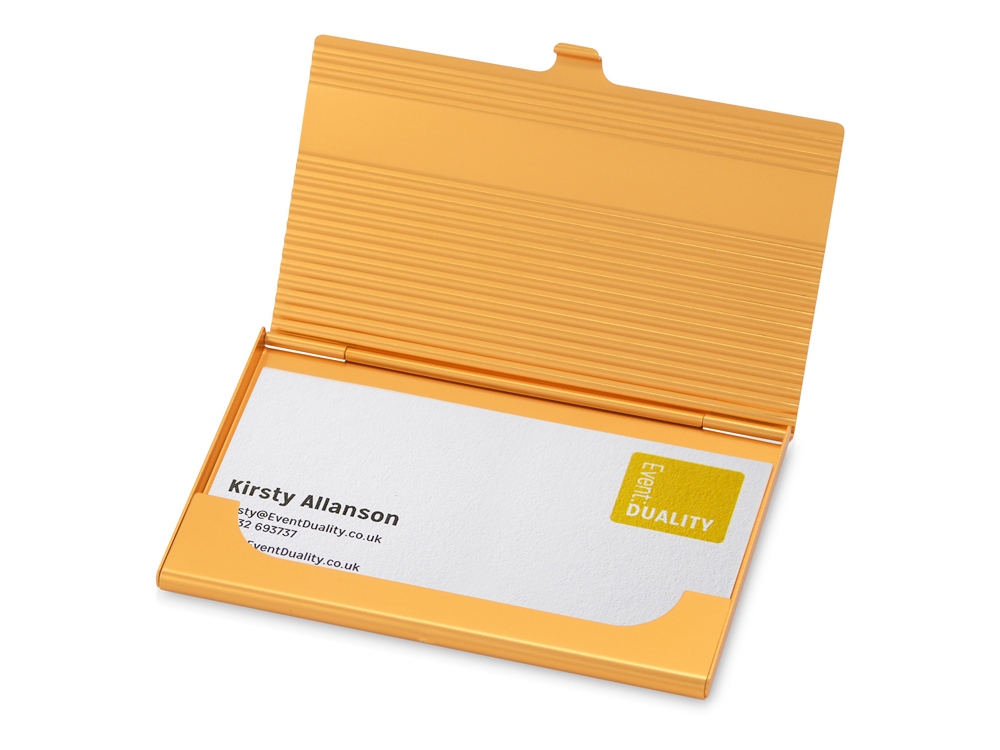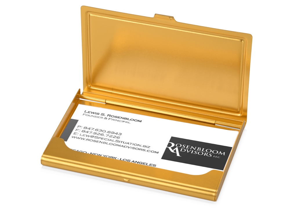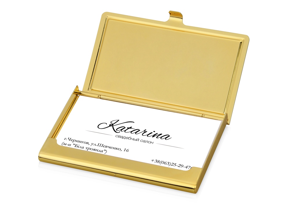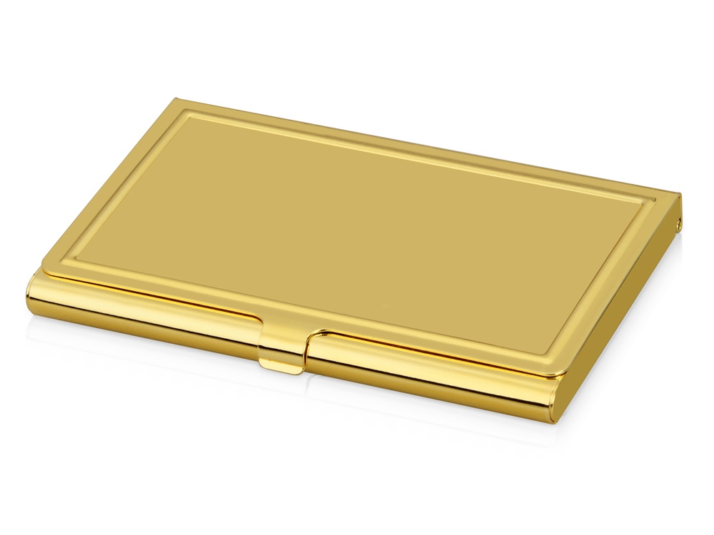 Стильная и элегантная металлическая визитница золотистого цвета подойдет в качестве презента как для мужчин, так и для женщин. На поверхности визитницы можно выгравировать поздравительную надпись или логотип организации.