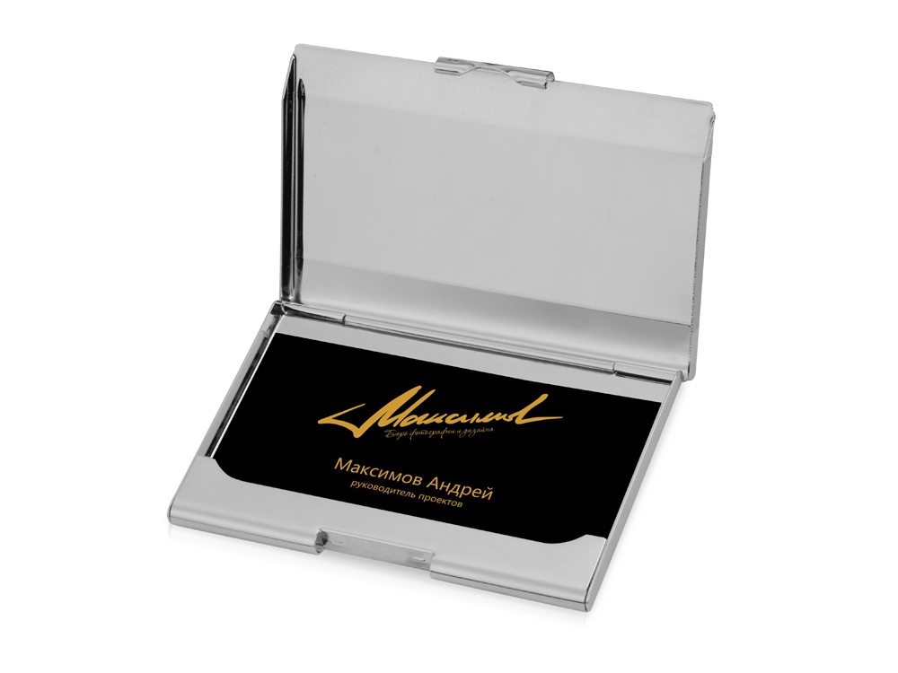 Металлическая визитница серебристого цвета с удобным механизмом открывания и закрывания – необходимый аксессуар, который дополнит корпоративный стиль любого сотрудника. Визитница имеет большую площадь для персонализации с помощью гравировки. Гравировка (оптоволоконный лазер) (Без чернения) на данный товар осуществляется бесплатно. Оплачивается только настройка оборудования в размере 1100 рублей на весь тираж.