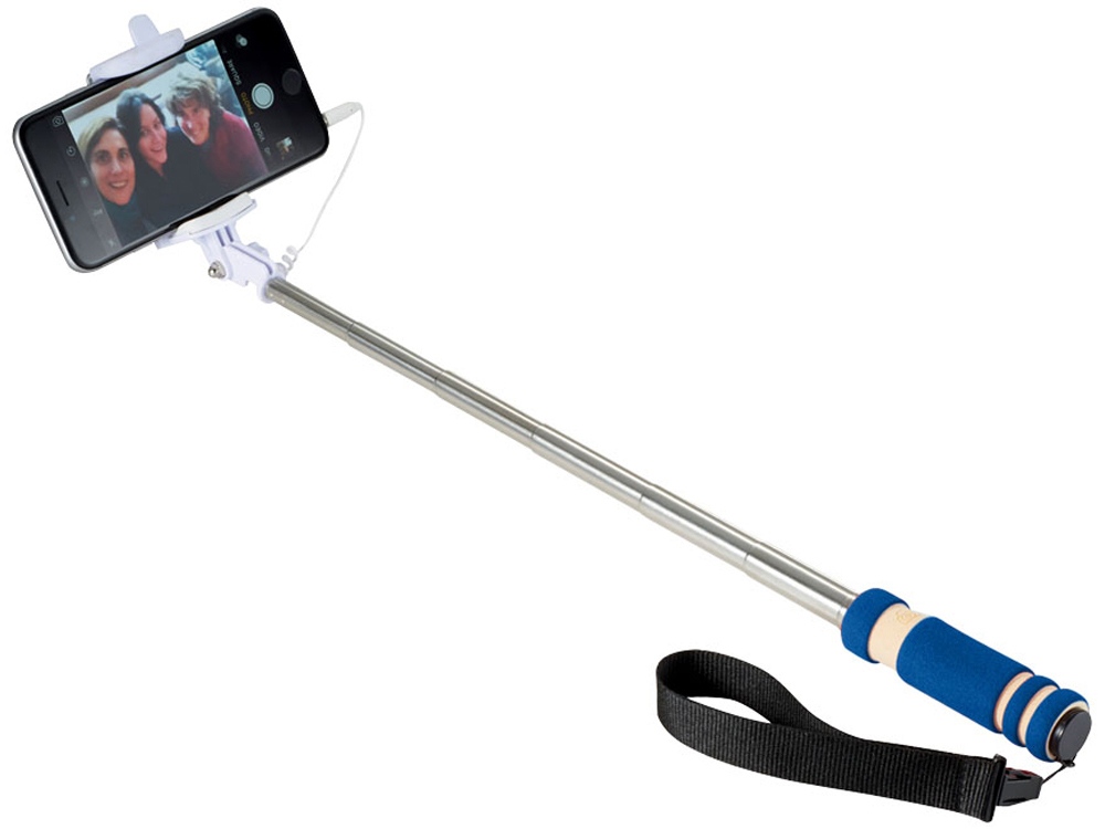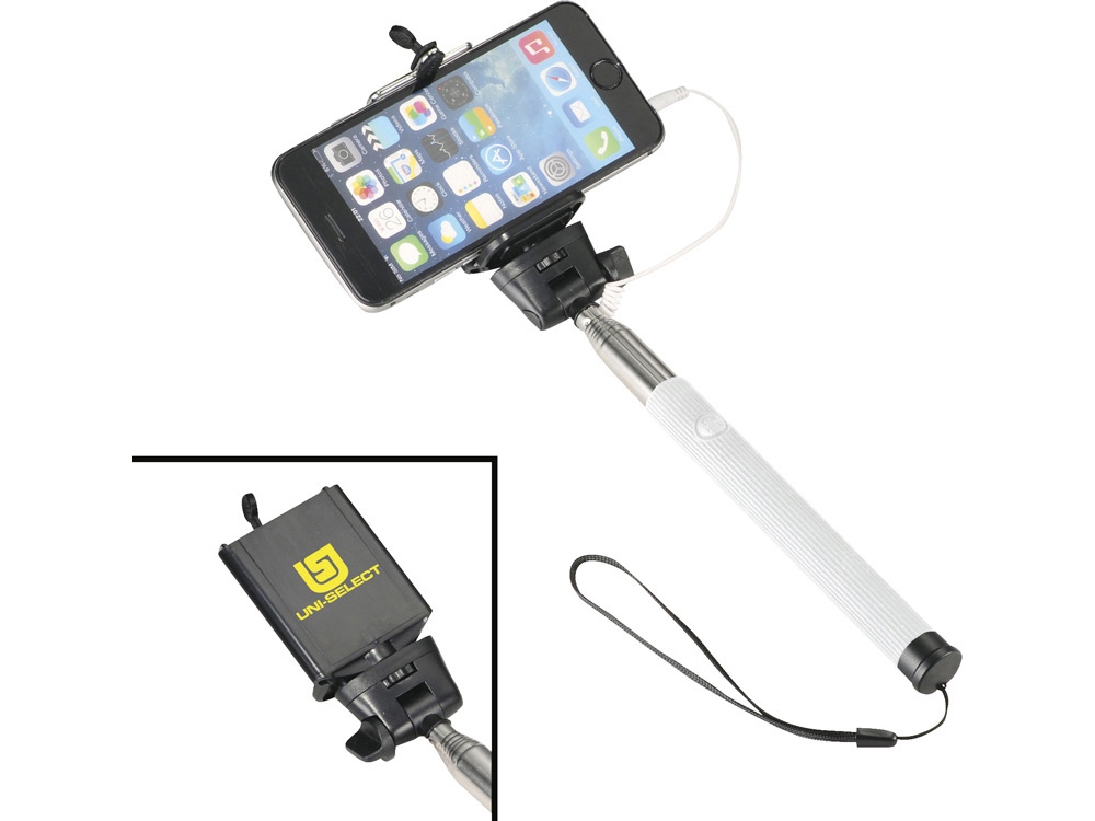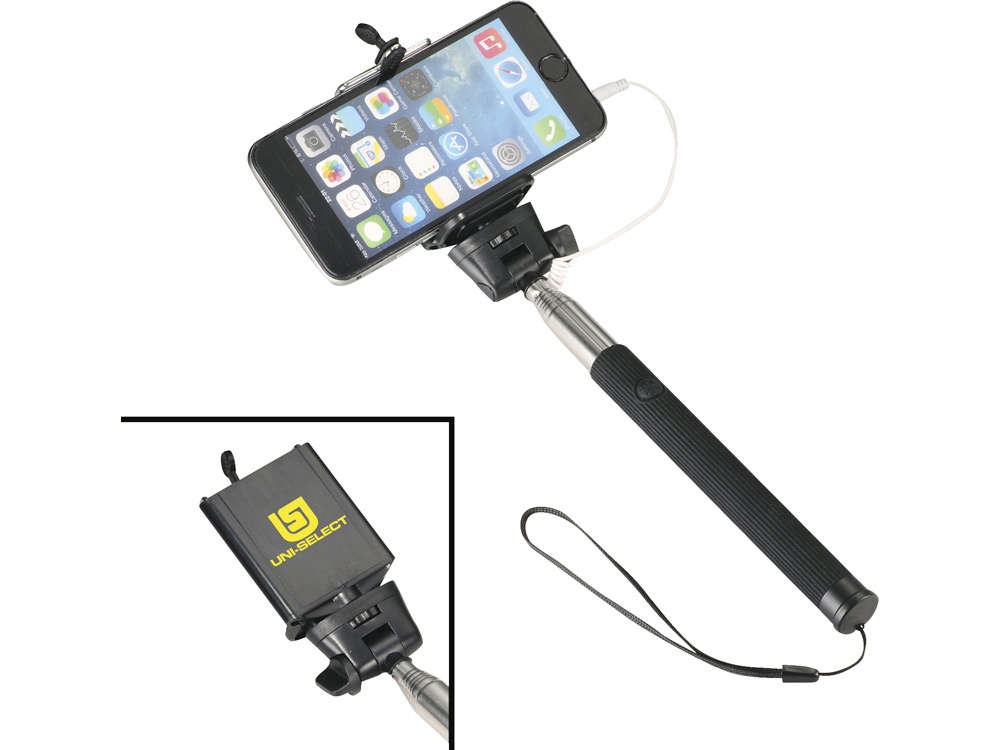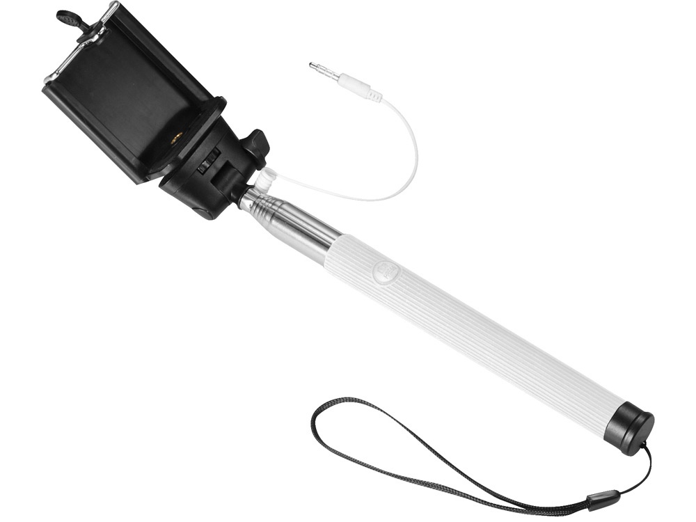 Проводной монопод. Сделайте идеальный селфи с этим выдвижным моноподом (до 90 см). Не требует батареи или использования приложения. Просто подключите 3,5 мм аудио разъем в телефон (совместим со всеми мобильными телефонами IOS) и нажмите на кнопку, расположенную на ручке. Регулируемый держатель телефона подходит для всех смартфонов. Силикон, сталь и ПВХ. Гравировка (оптоволоконный лазер) (Без чернения) на данный товар осуществляется бесплатно. Оплачивается только настройка оборудования в размере 1100 рублей на весь тираж.