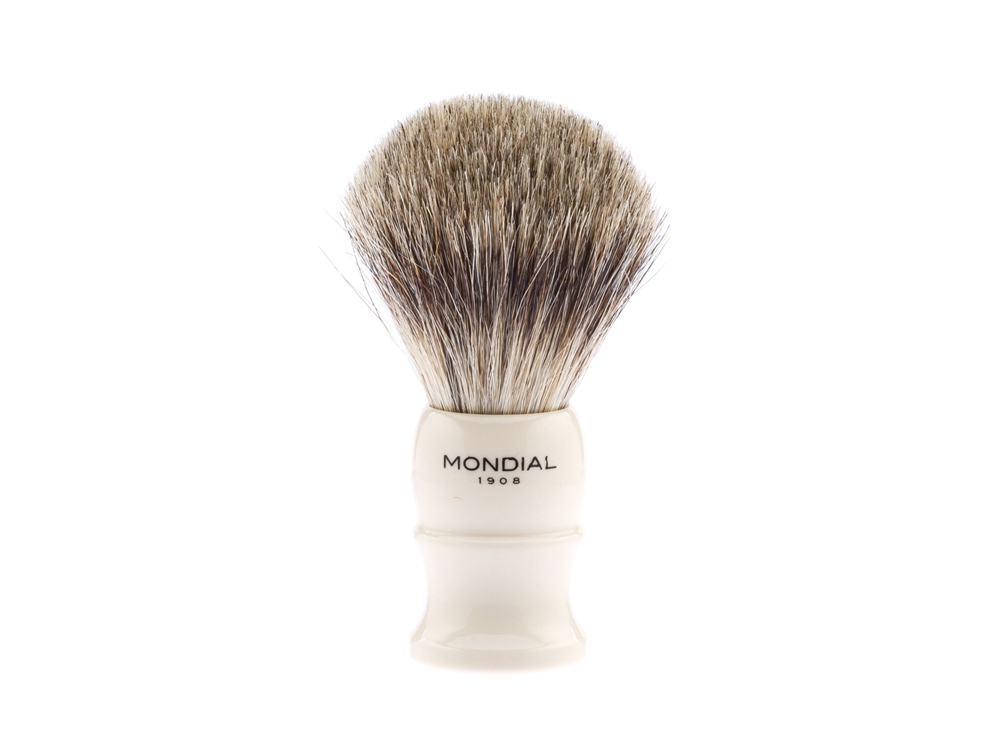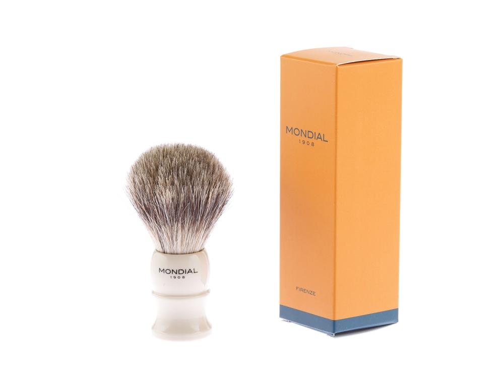 Кисть помазка Mondial – натуральный барсучий ворс, со свойственными только ему мягкостью и упругостью. Волоски помазка отлично задерживают влагу, позволяя равномерно нанести пену для бритья на лицо.