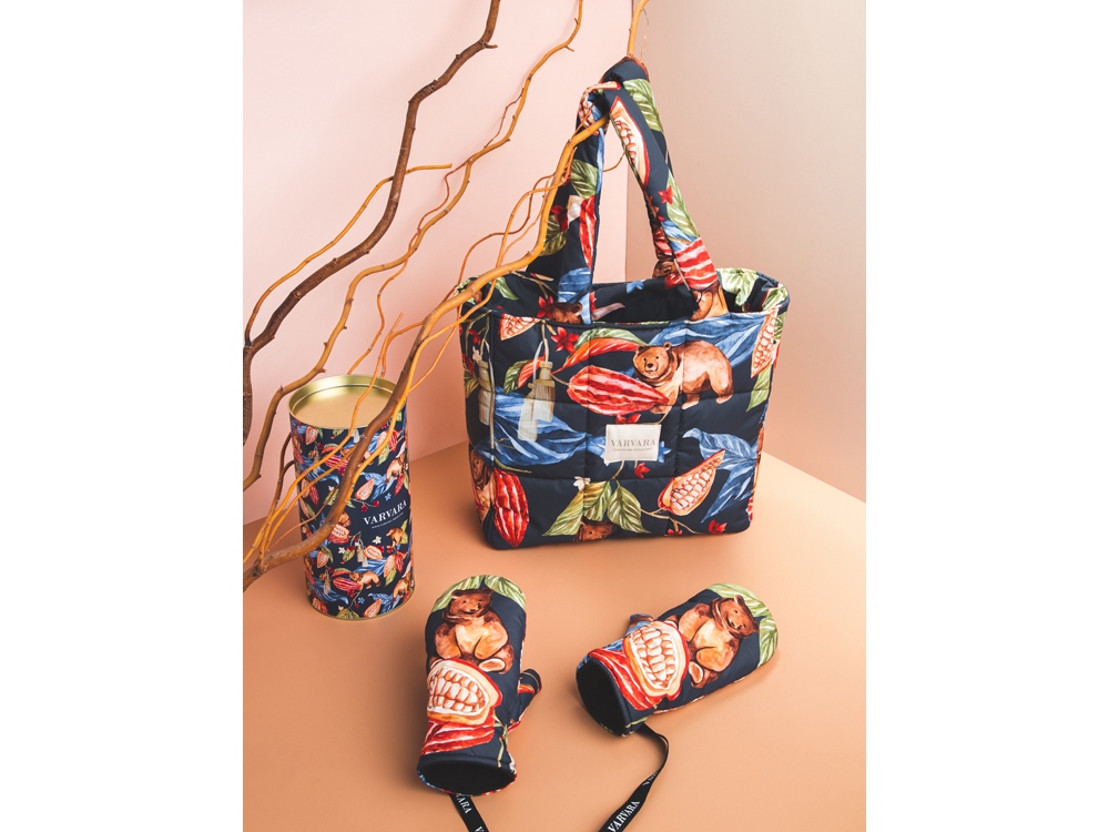 Принт Мишки в шоколаде продолжает серию сказочных принтов Varvara. Задорные медвежата прячутся в листьях и плодах вечнозеленого какао, создавая яркий, эмоциональный узор.