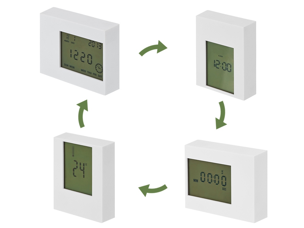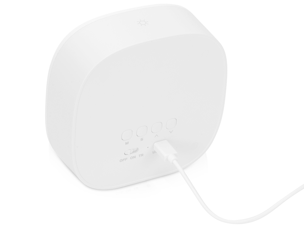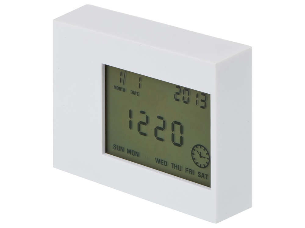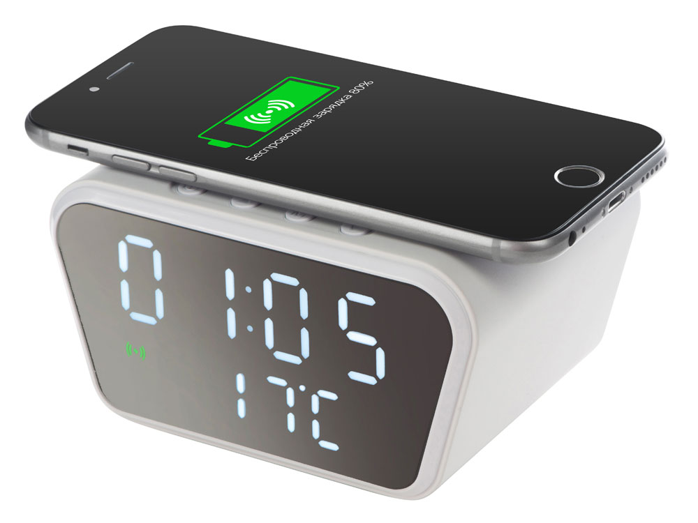 Многофункциональные настольные часы с подсветкой, которые в зависимости от положения показывают разные значения: дата и время, будильник, таймер и температура воздуха. Тампопечать (1 цвет (белые изделия)) на данный товар осуществляется бесплатно. Оплачивается только настройка оборудования в размере 6400 рублей на весь тираж.