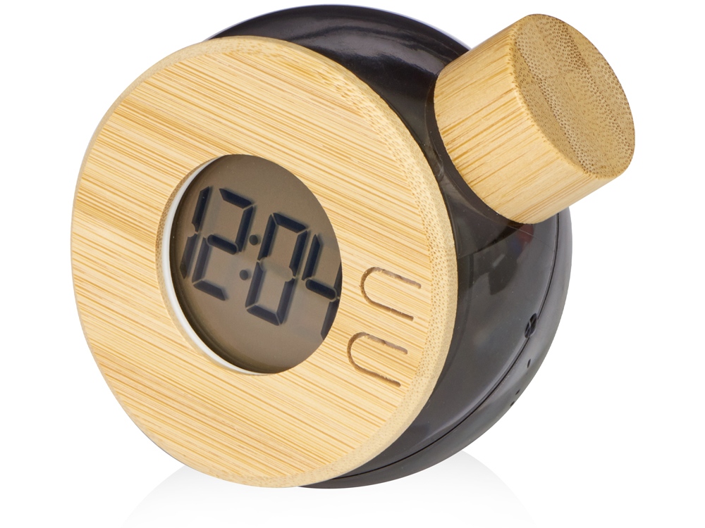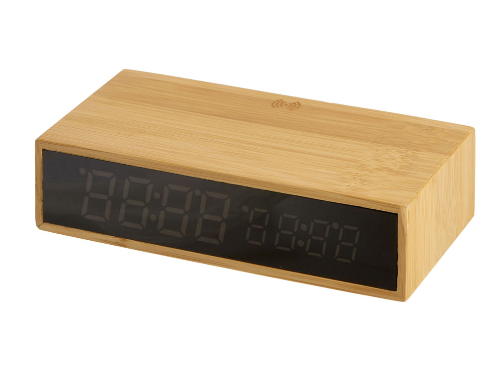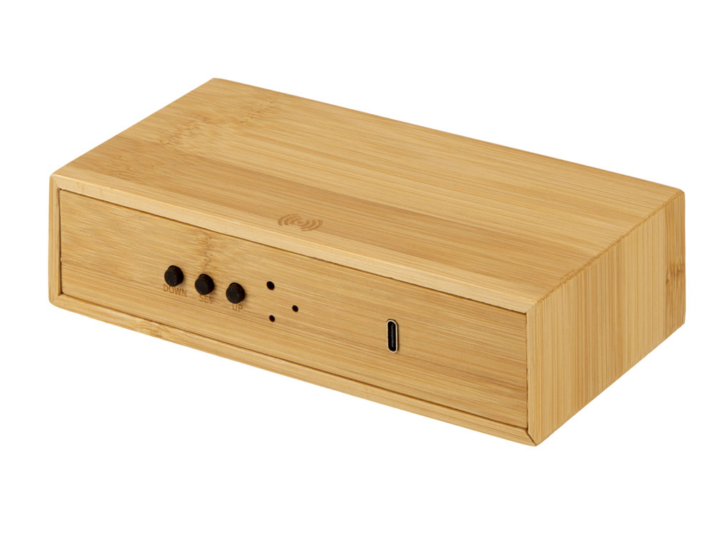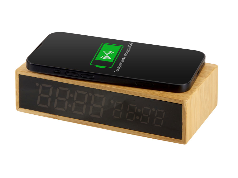Настольные часы с корпусом из бамбука, имеют функцию беспроводной зарядки для смартфонов (10 Вт). Яркий дисплей. Функция измерения температуры окружающей среды.
