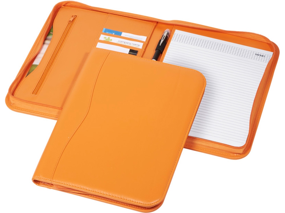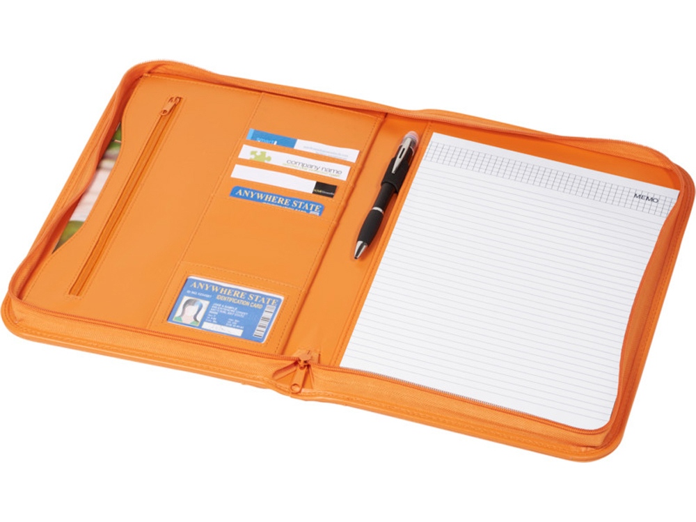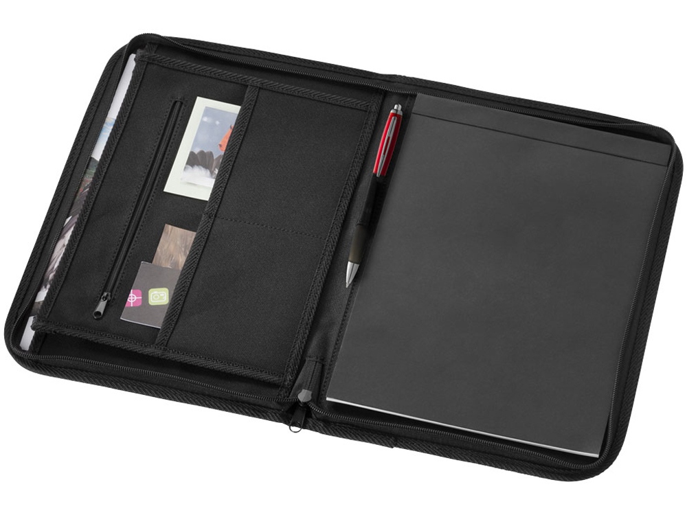 Папка с застежкой-молнией, держателем для пучки, карманом на молнии, отделениями для документов и блокнотом А4 с 20 страницами линованной бумаги. Ручка и принадлежности не включены.