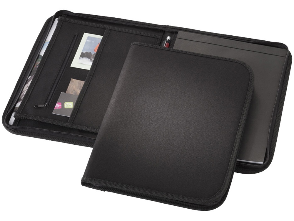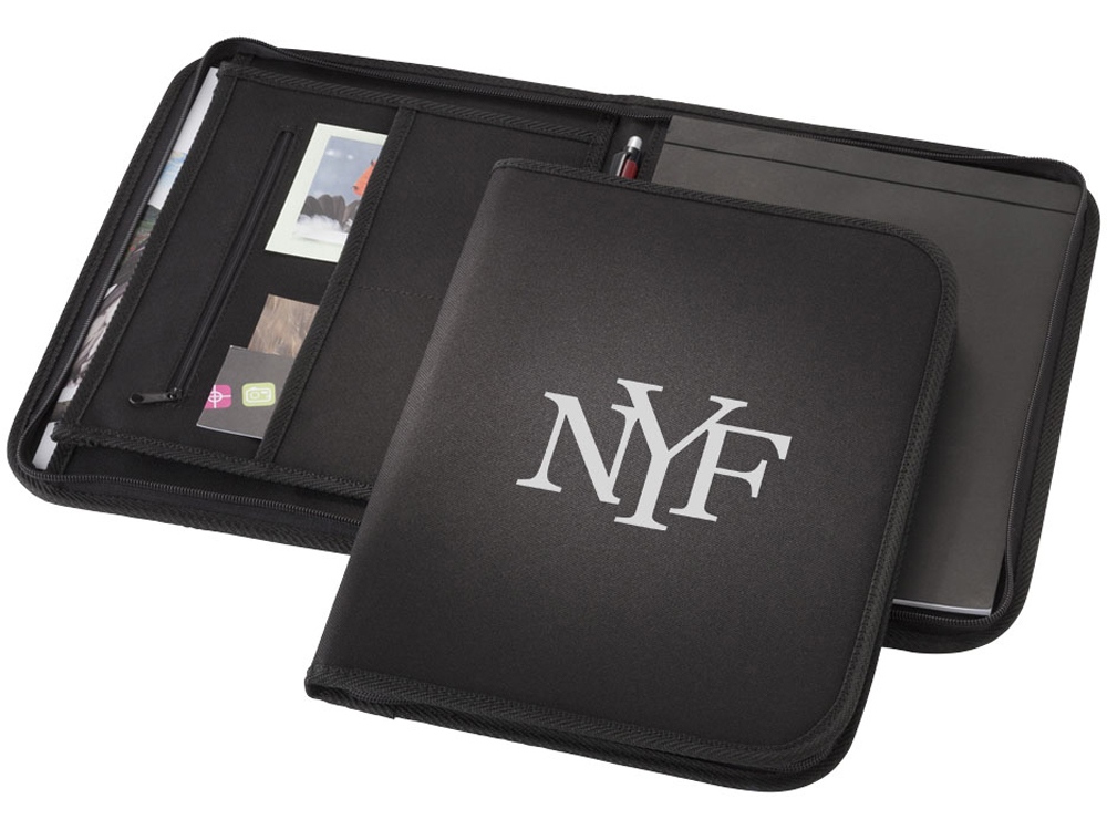 Папка Berkeley A4 на молнии. Папка с застежкой-молнией, карманами для документов и блокнотом с 20 страницами линованной бумаги. Ручка и принадлежности не включены. Полиэстер 600D. Термотрансфер (1 цвет (цветные изделия)) на данный товар осуществляется бесплатно. Оплачивается только настройка оборудования в размере 10000 рублей на весь тираж.