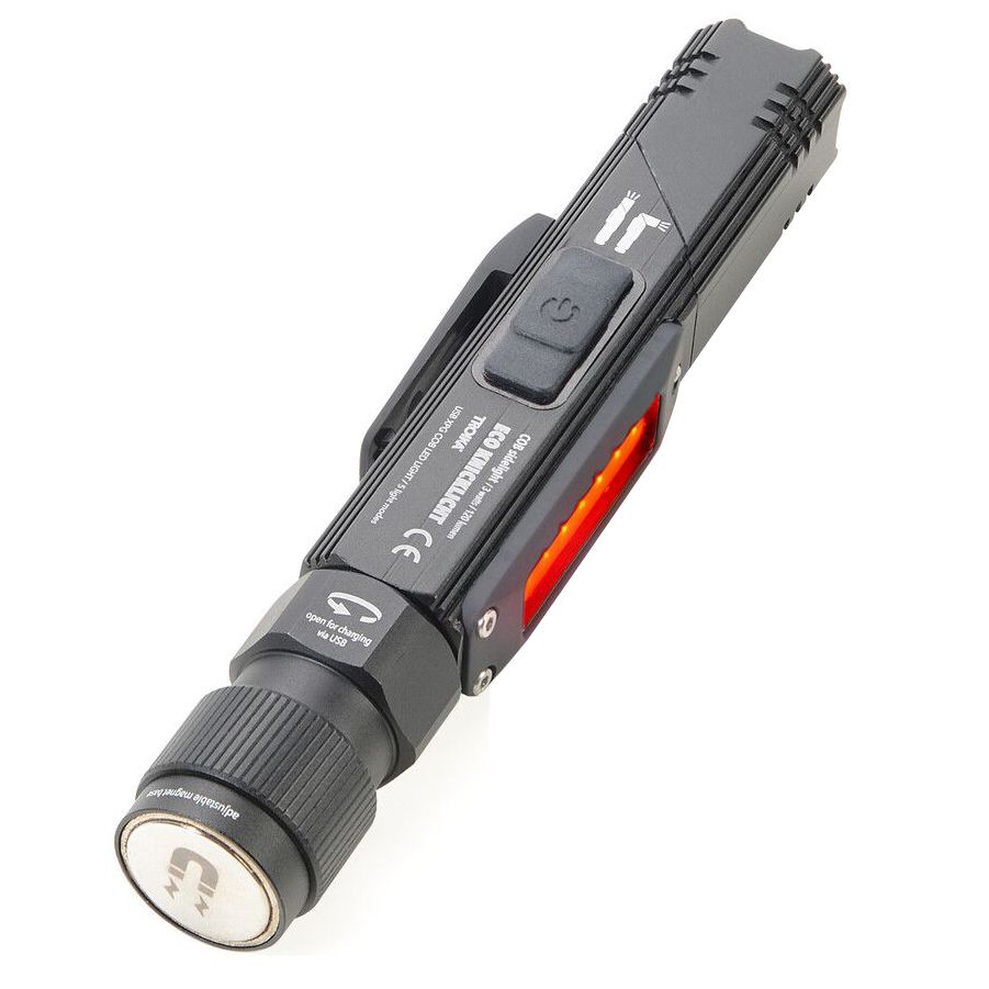 Светодиод COB-LED сбоку работает как фонарь-факел и обеспечивает световой поток яркостью до 200 лм. Это может быть белый свет для работы, либо красный или красный моргающий свет для предупреждения.