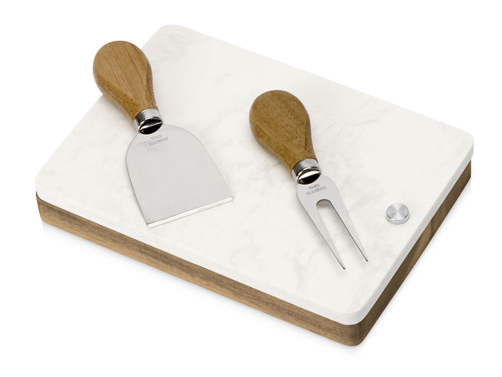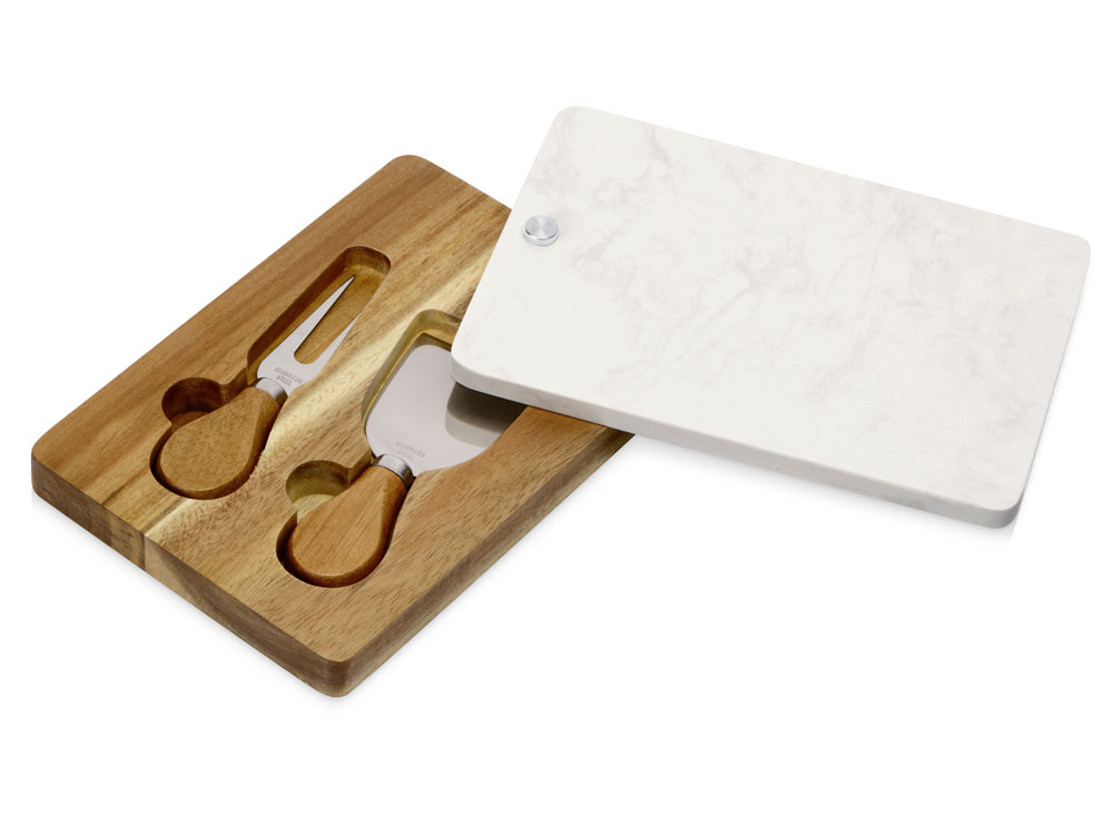 Набор для сыра бренда Eat&Bite Select состоит из ножа и вилки в футляре. Высококачественные материалы — акация и искусственный мрамор — обеспечивают набору долгую жизнь и благородный внешний вид. Крышка футляра, выполненная из белого мрамора, благодаря своей твердости может использоваться как разделочная доска, а благородный внешний вид делает ее идеальным вариантом для сервировки сыров и закусок.