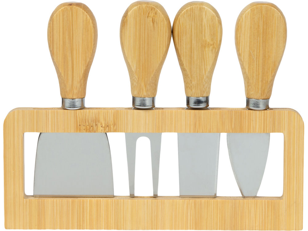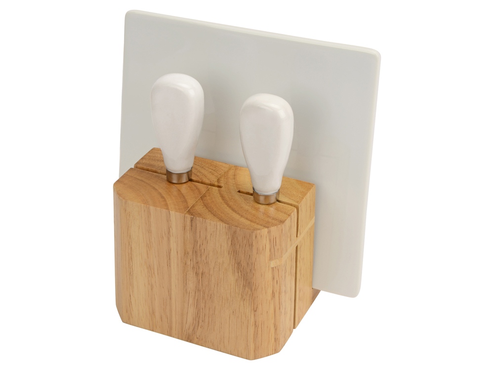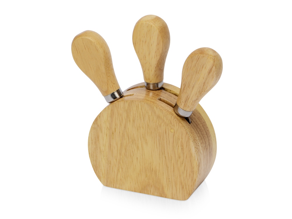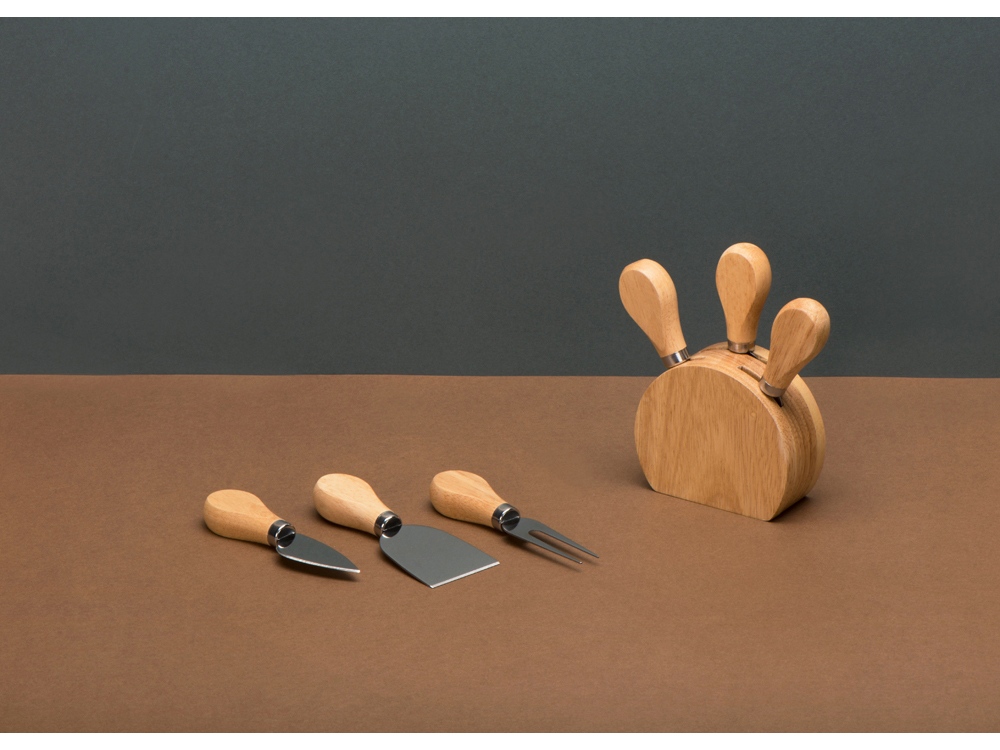 Набор состоит из ножей для сыра, подставки и удобной крафт-коробки. Кухонные инструменты выполнены из надежного каучукового дерева. Оно устойчиво к воздействию влаги, перепадам температуры и большим нагрузкам. Приборы устанавливаются в удобную деревянную подставку, где их можно хранить после использования. В комплект входят: