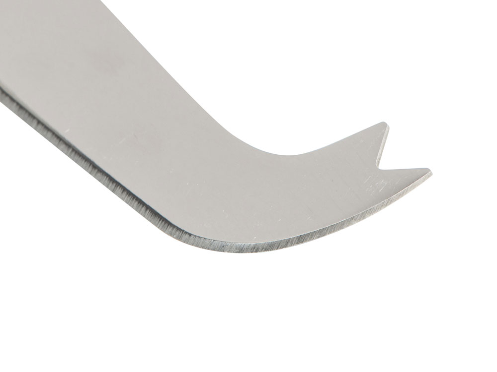 Классический нож для сыра имеет изогнутую форму, благодаря чему вам не придется держать его на весу — просто поставьте лезвие на разделочную поверхность и слегка нажмите на рукоятку, это обеспечит легкий ход. Раздвоенный кончик позволяет накалывать кусочки и разделять ломтики сыра, не касаясь его руками.