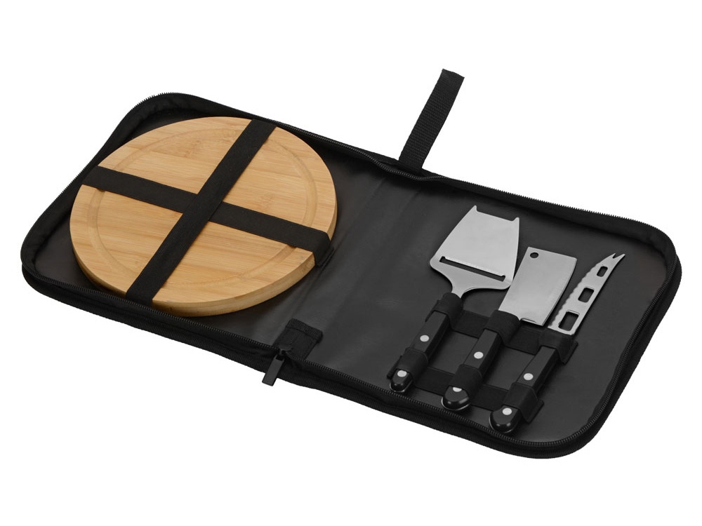 Набор для сыра не изменяет общему стилю Fabrizio: доска и три сырных ножа упакованы в чехол из искусственной кожи, который прекрасно сочетается по текстуре и цвету с другими изделиями серии. Чехол на молнии раскрывается как папка, надежно защищая принадлежности от механических повреждений и позволяя компактно и удобно хранить принадлежности. Для подвешивания и переноски предусмотрена текстильная петля на корешке. Внутри чехол имеет фиксирующие резинки для каждого ножа и доски.