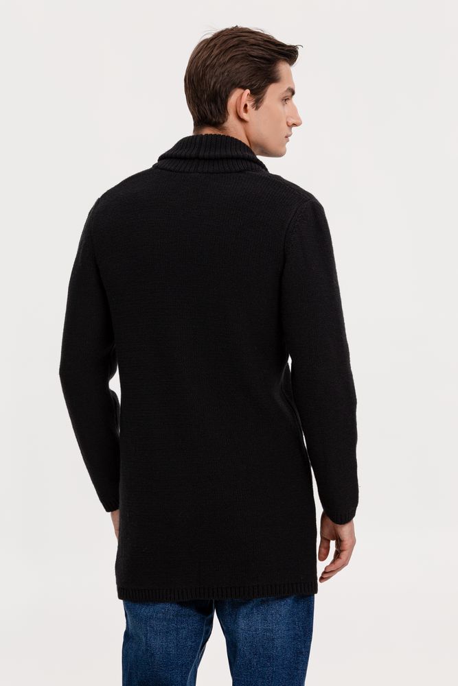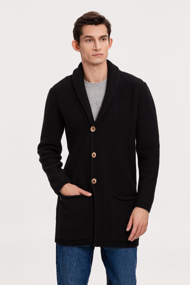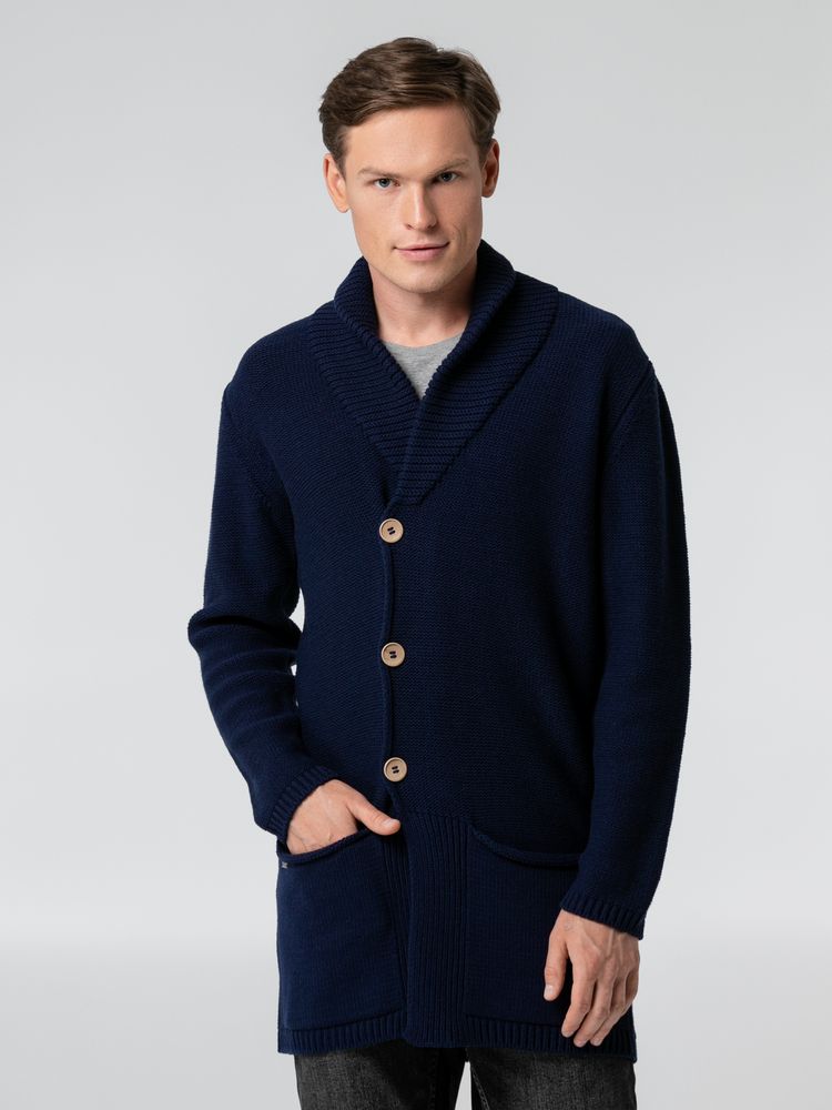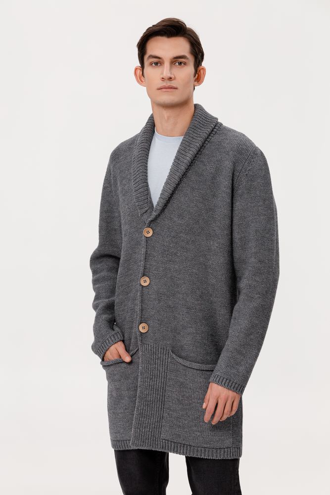 Двухслойный воротник-шалька, цельновязаные карманы, имитирующие накладные, контрастные пуговицы из пластика. Воротник, манжеты и низ изделия выполнены резинкой.Таблица размеров: