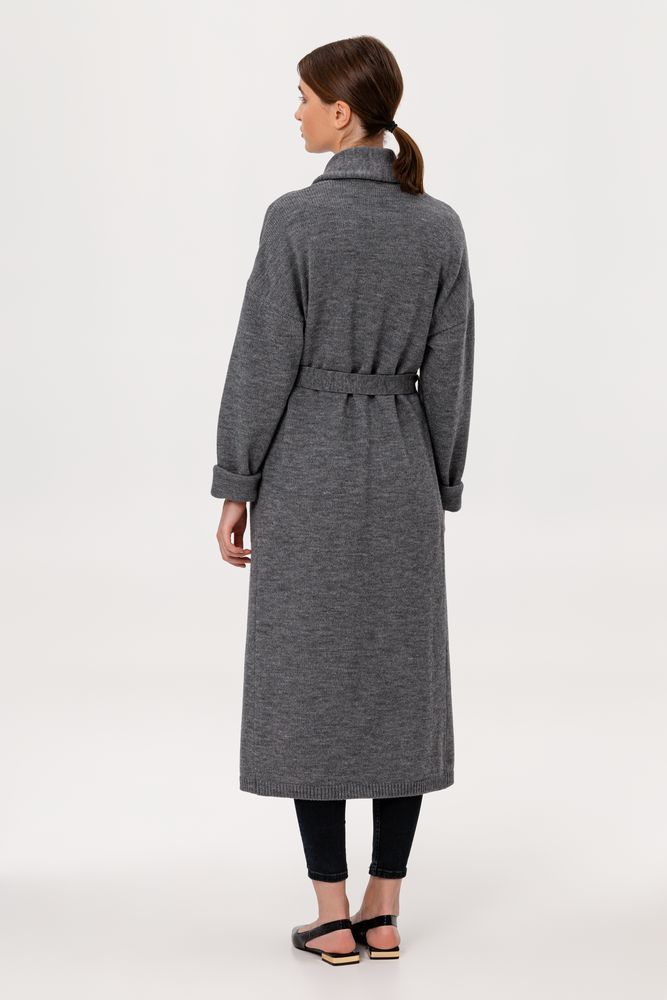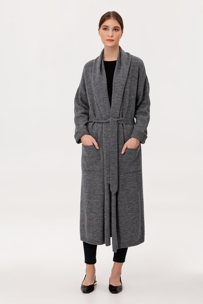 Длинный кардиган-халат чулочной вязки из дополнительно смягченной пряжи.